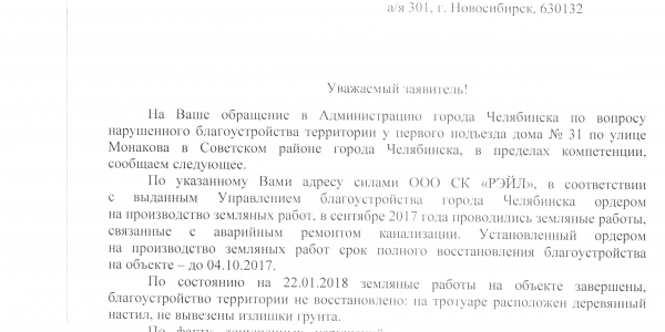 Номер жалобы:28463 Тип жалобы:Иные проблемы ЖКХ Название объекта:Гжи Город:Челябинск Адрес:Челябинск, улица Монакова, 31 Описание жалобы:После проведения ремонтных работ у подъезда 1 по Монакова 31 осталась куча земли и деревянный помост. Необходимо вернуть прежнее благоустройство. Статус: