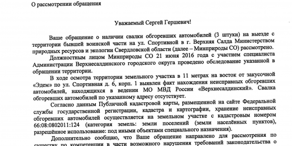 Номер жалобы:5471 Тип жалобы:Несанкционированные свалки Название объекта: Регион:Свердловская область Город:Верхняя Салда Адрес:Спортивная улица Описание жалобы:На территории бывшей воинской части на ул. Спортивной свалка обгоревших автомобилей (3 штуки). Свалка мусора на выезде с территории бывшей воинской части у бывшего КПП (здание с магазинами рядом с домом 6 по ул. Спортивная).