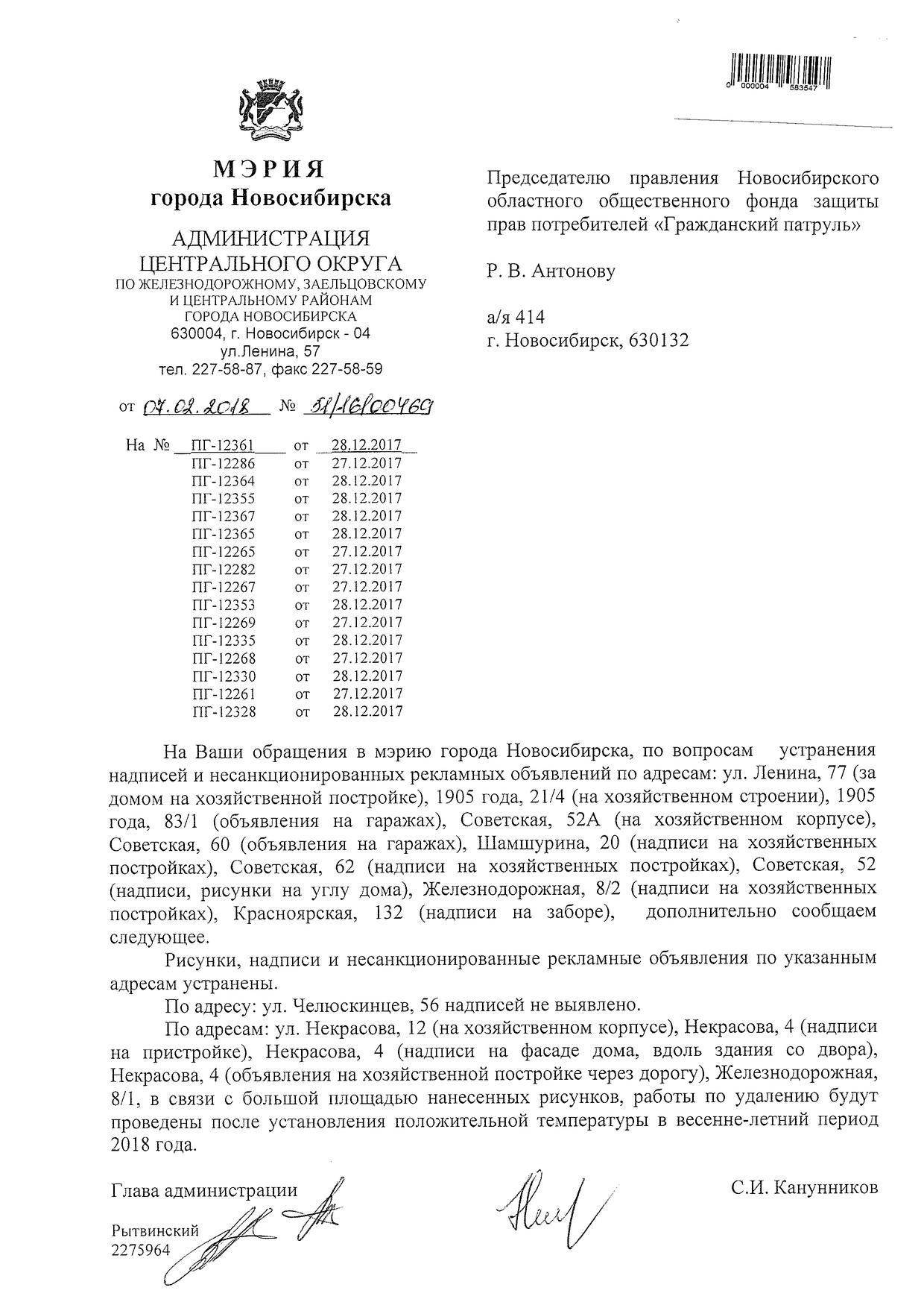 Номер жалобы:28263 Тип жалобы:Иные проблемы ЖКХ Название объекта:Управляющая Компания Регион:Новосибирская область Город:Новосибирск Адрес:Красный пр., 69 Описание жалобы:Не в тон закрашенные надписи Статус: