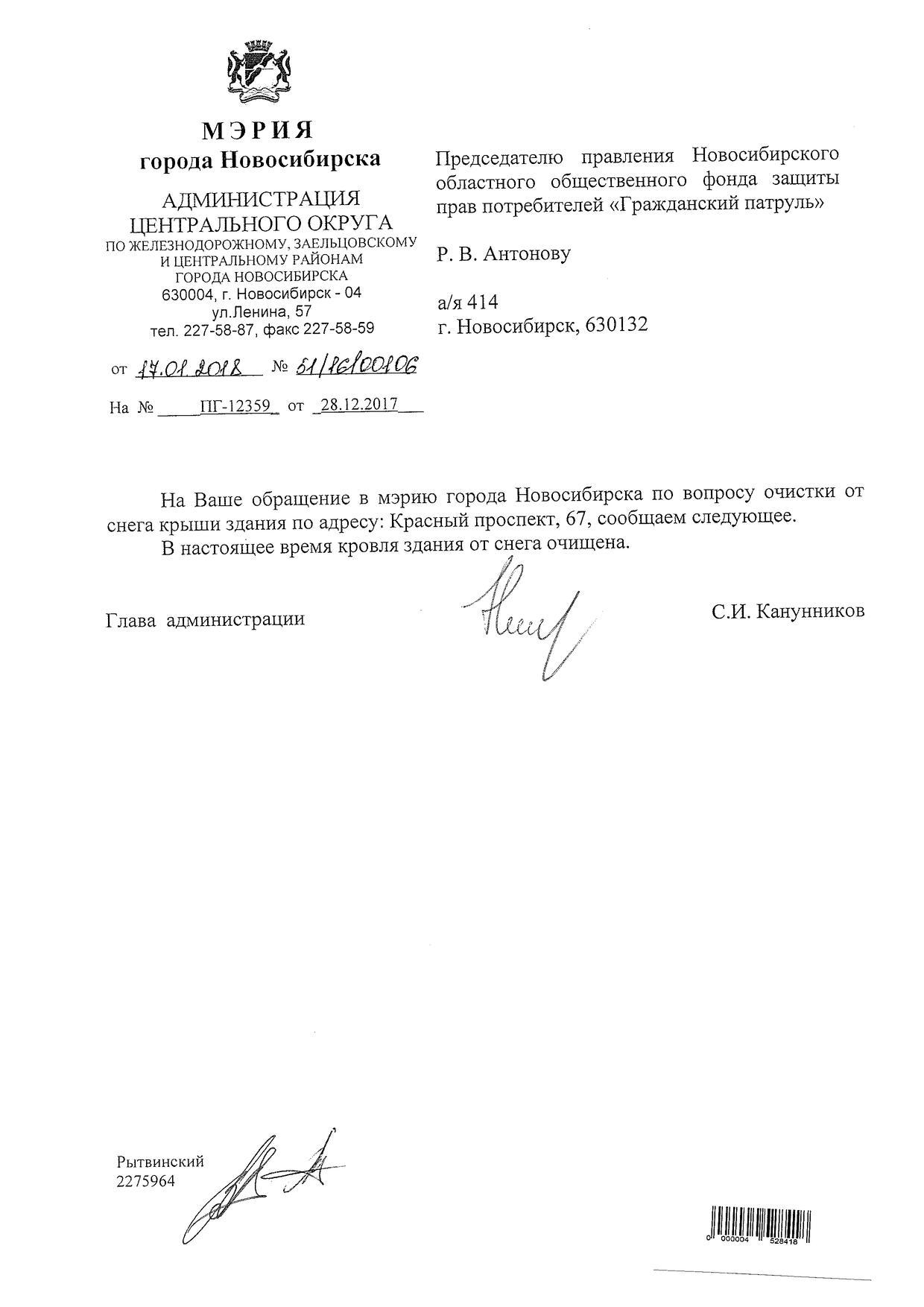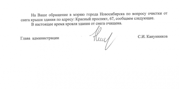 Номер жалобы:28262 Тип жалобы:Иные проблемы ЖКХ Название объекта:Управляющая Компания Регион:Новосибирская область Город:Новосибирск Адрес:Красный пр., 67 Описание жалобы:Снег на крыше дома Статус: