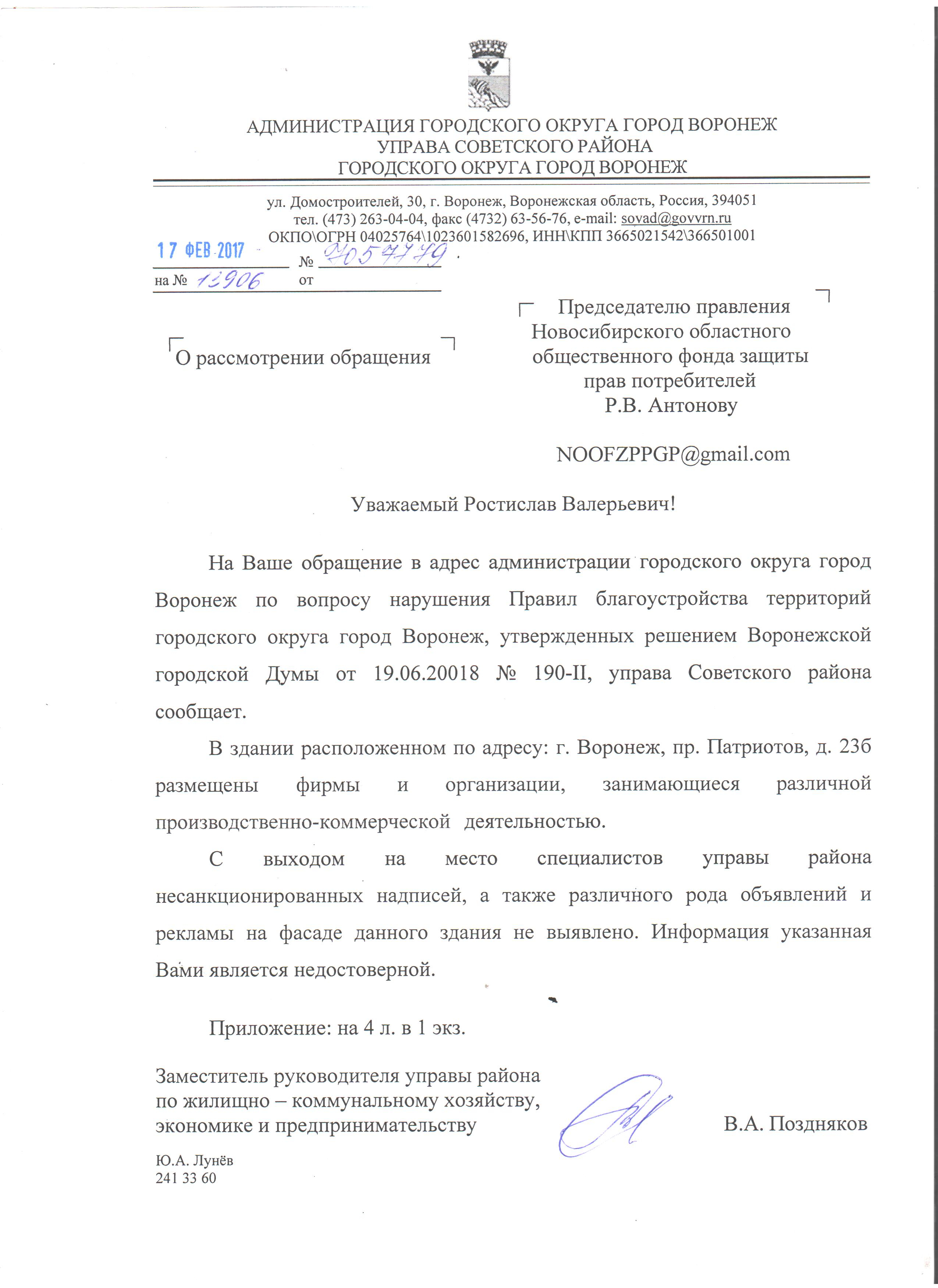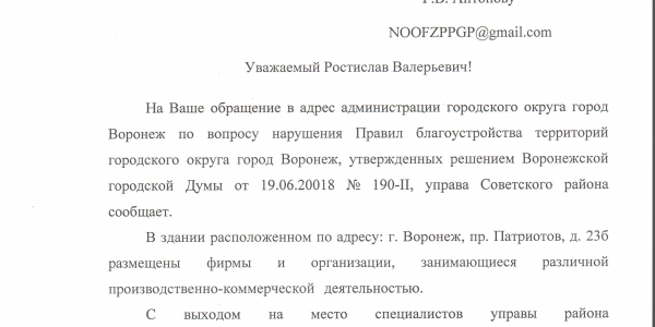 Номер жалобы:13906 Тип жалобы:Прочее Название объекта:Ук Регион:Воронежская область Город:Воронеж Адрес:пр. Патриотов, 23Б Описание жалобы:Надписи на стенах мкд Статус: