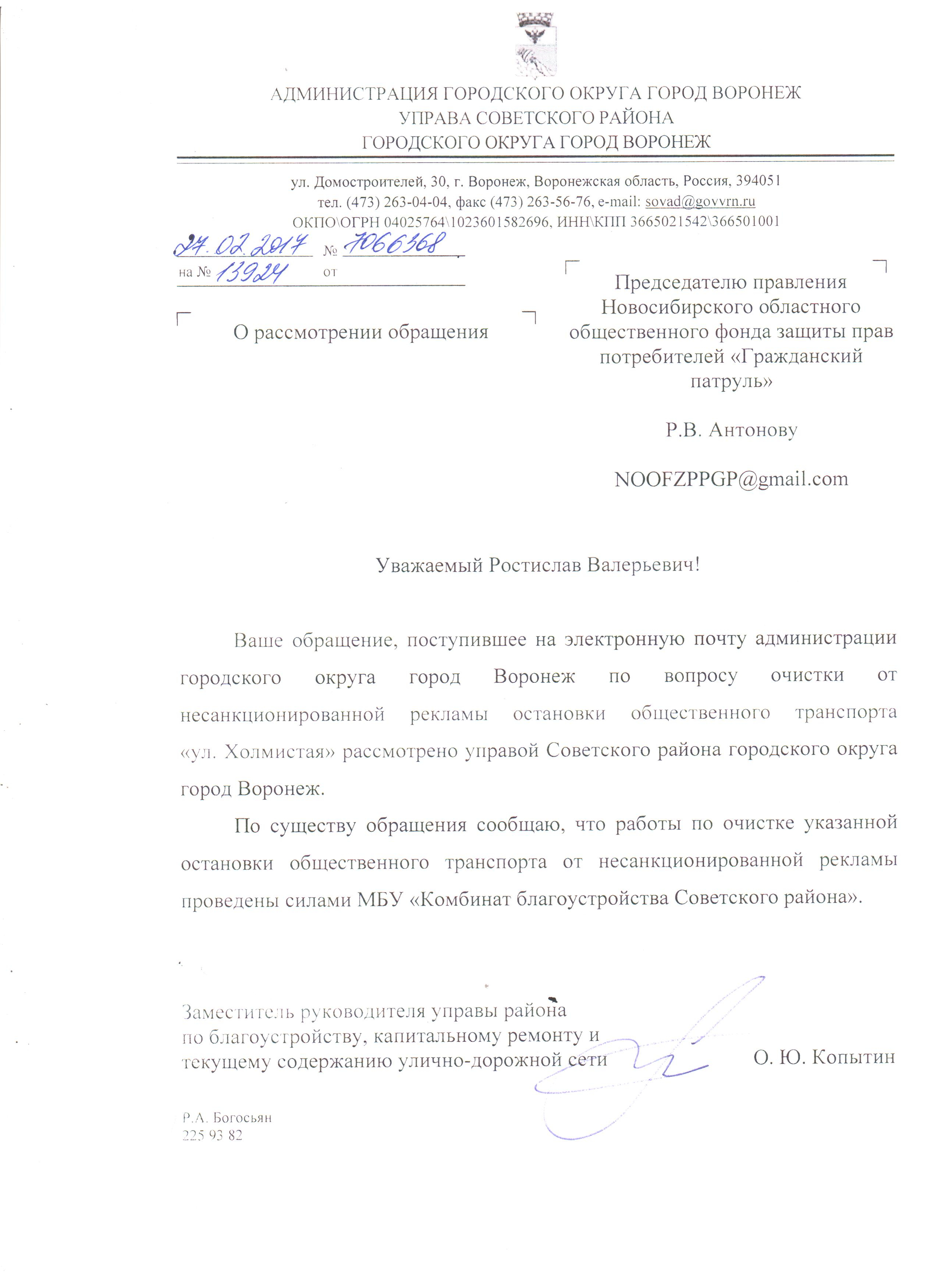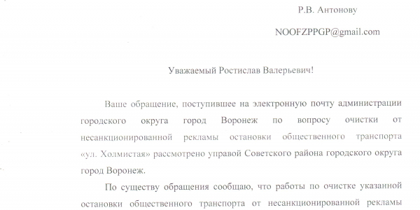 Номер жалобы:13924 Тип жалобы:Прочее Название объекта:Ком Службы Регион:Воронежская область Город:Воронеж Адрес:ул. Героев Сибиряков, Описание жалобы:Ост. Холмистая, Обьявления Статус: