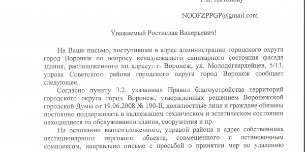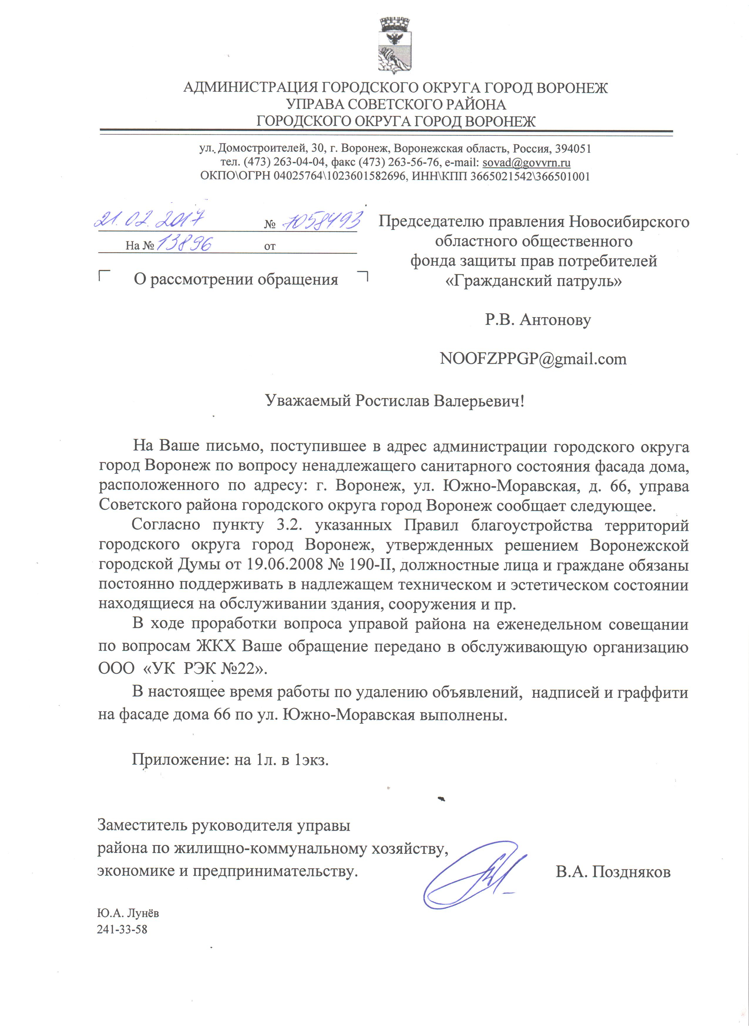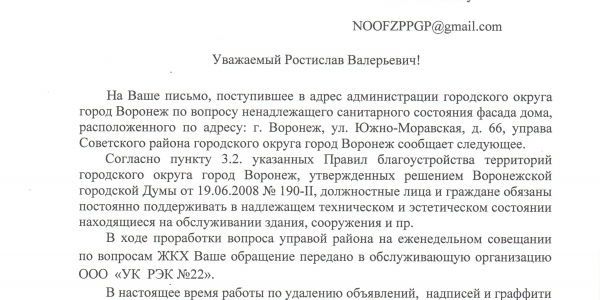Номер жалобы:13896 Тип жалобы:Прочее Название объекта:Ук Регион:Воронежская область Город:Воронеж Адрес:Южно-Моравская ул., 66 Описание жалобы:Надписи Статус: