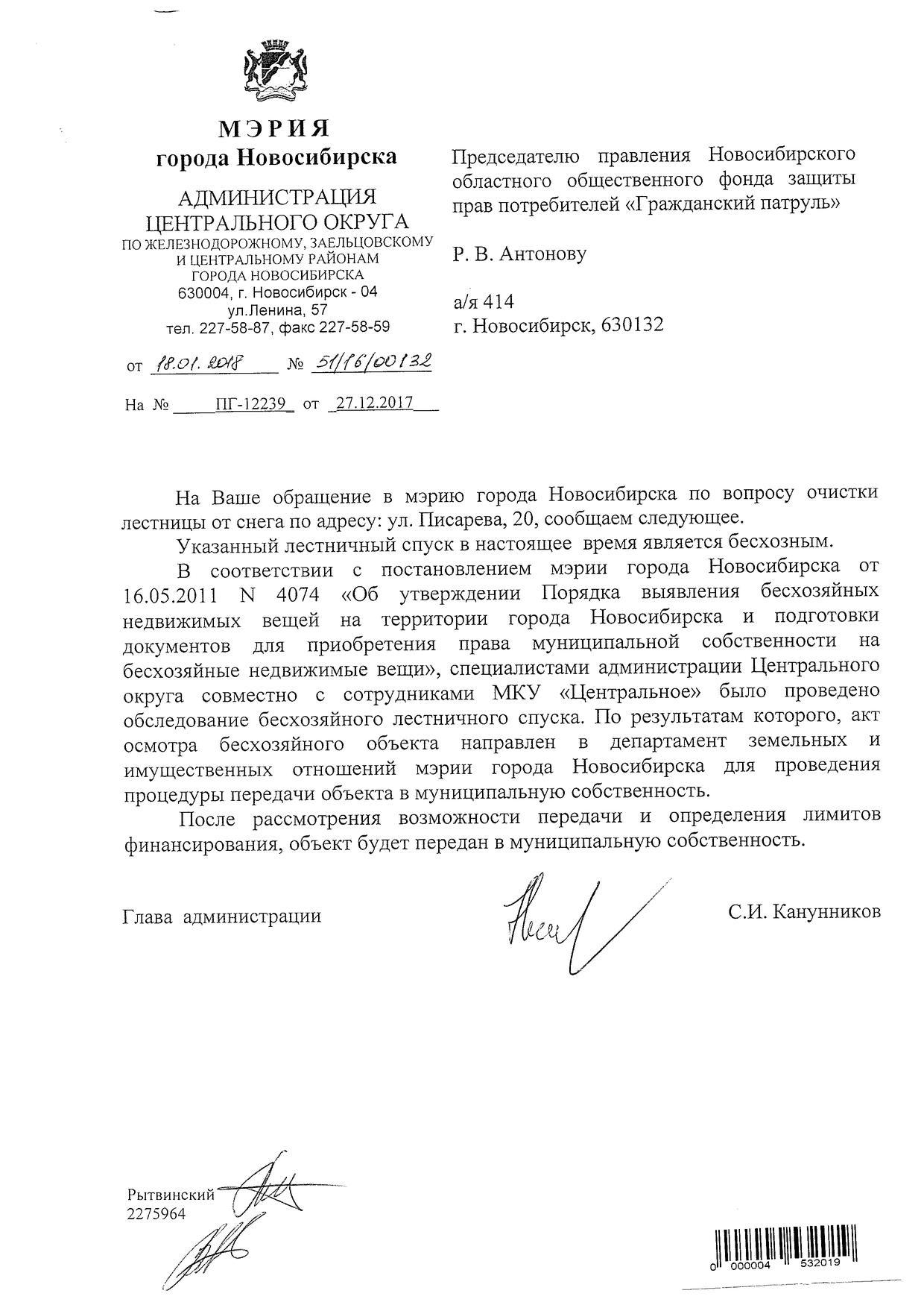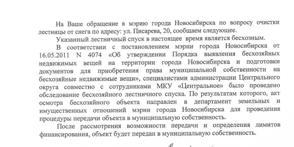 Номер жалобы:28141 Тип жалобы:Иные проблемы ЖКХ Название объекта:Управляющая Компания Регион:Новосибирская область Город:Новосибирск Адрес:ул. Писарева, 20 Описание жалобы:За домом нерасчищенна лестница Статус: