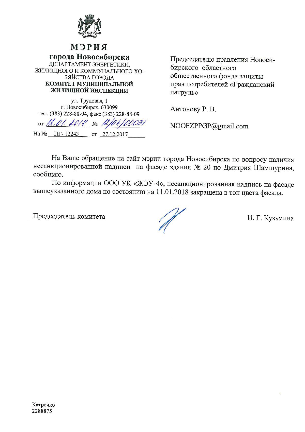 Номер жалобы:28150 Тип жалобы:Иные проблемы ЖКХ Название объекта:Управляющая Компания Регион:Новосибирская область Город:Новосибирск Адрес:ул. Шамшурина, 20 Описание жалобы:Надписи на фасаде дома Статус: