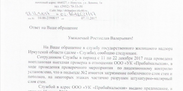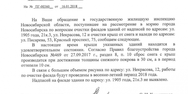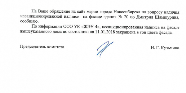 Номер жалобы:28148 Тип жалобы:Иные проблемы ЖКХ Название объекта:Управляющая Компания Регион:Новосибирская область Город:Новосибирск Адрес:ул. Ленина, 71/3 Описание жалобы:Ленина 71 надписи на фасаде дома Статус: