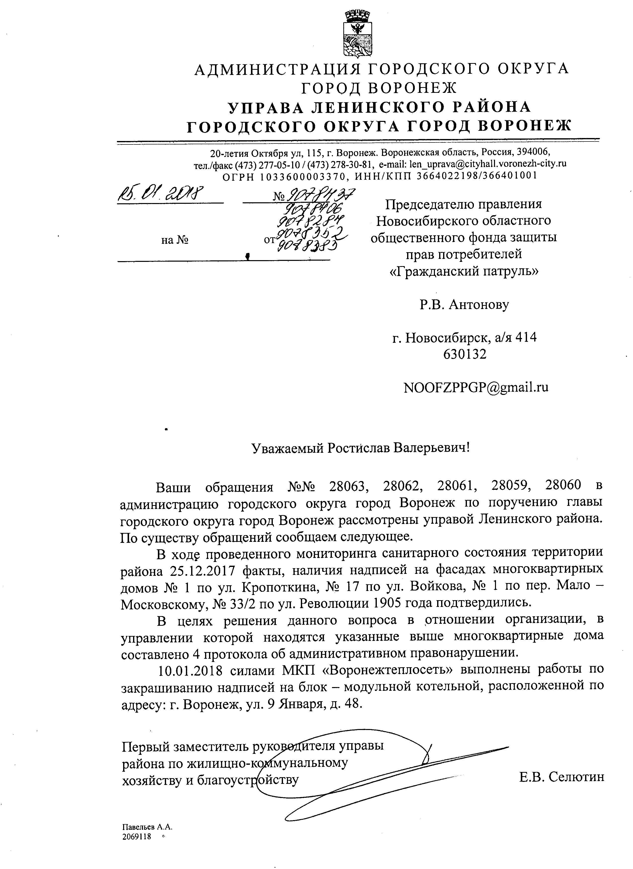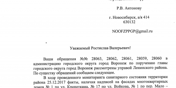 Номер жалобы:28060 Тип жалобы:Иные проблемы ЖКХ Название объекта:Управа Ленинского района г. Воронежа Регион:Воронежская область Город:Воронеж Адрес:ул. Кропоткина, 1 Описание жалобы:Граффити на стенах, рекламирующие ресурсы по продаже наркосодержащих смесей. Статус: