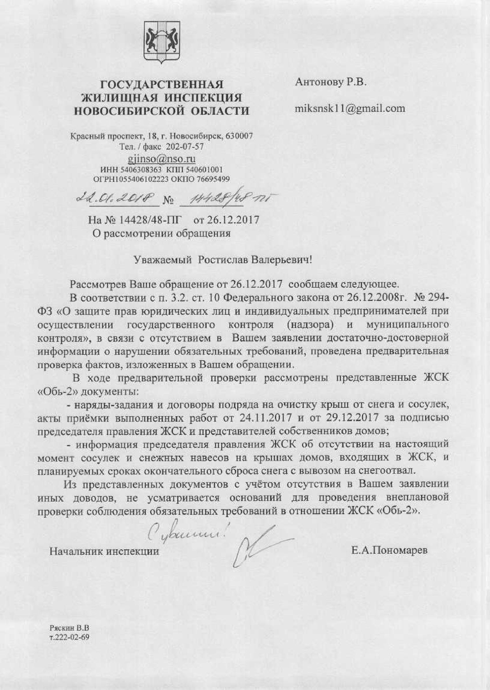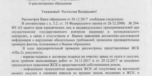Номер жалобы:27994 Тип жалобы:Иные проблемы ЖКХ Название объекта:Управляющая Компания Регион:Новосибирская область Город:Новосибирск Адрес:Красный пр., 63 Описание жалобы:Снег на крыше дома Статус: