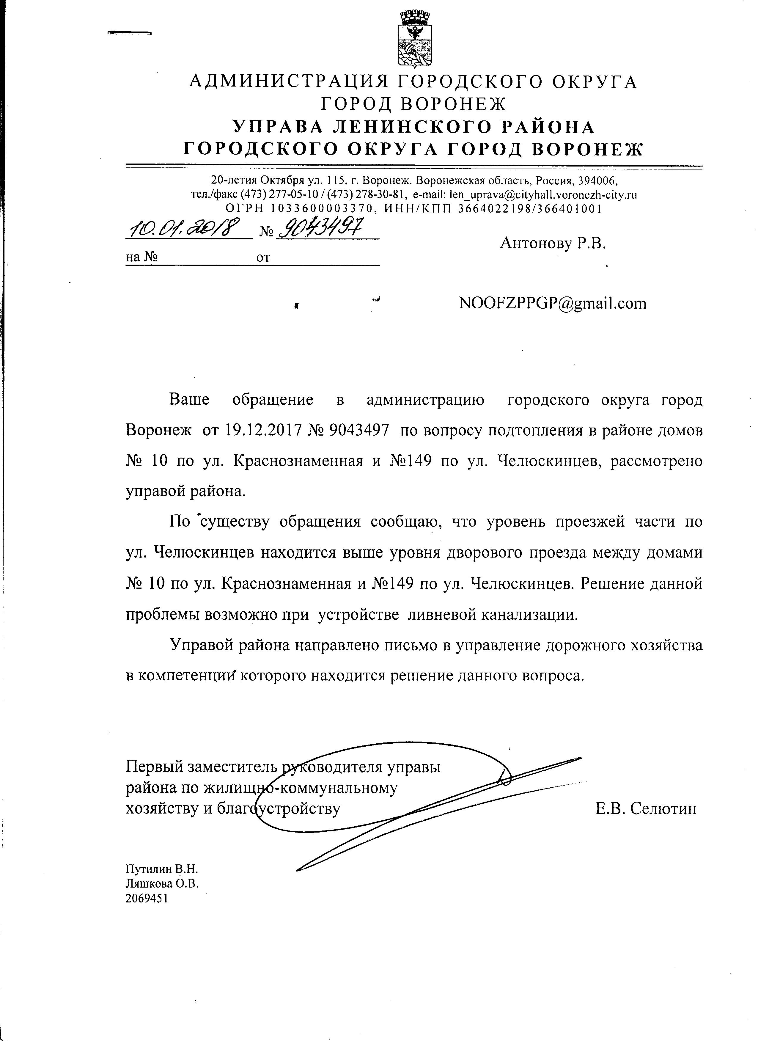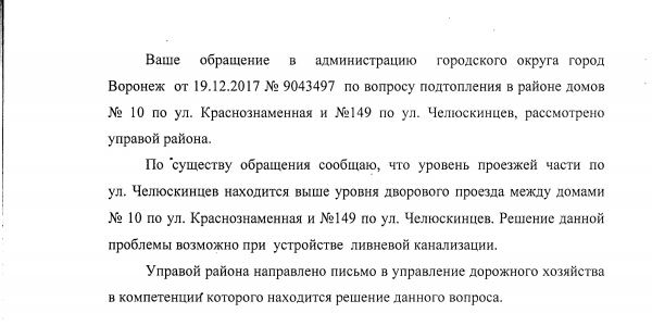 Номер жалобы:27930 Тип жалобы:Иные проблемы ЖКХ Название объекта:Администрация г. Воронежа Регион:Воронежская область Город:Воронеж Адрес:ул. Краснознамённая, 10 Описание жалобы:Пересечение улиц Краснознаменная 10, Челюскинцев 149 и Моисеева 9б затопило. Вода из-за дождей стоит и не сливается Статус:
