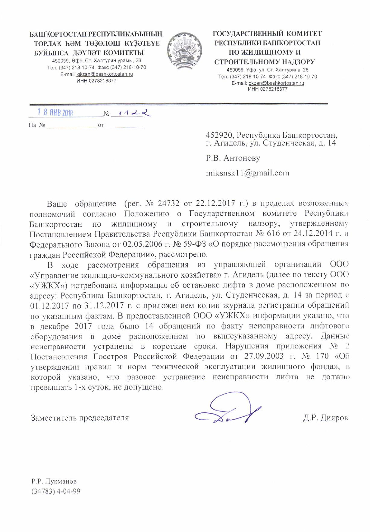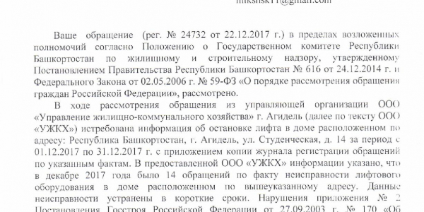 Номер жалобы:27937 Тип жалобы:Иные проблемы ЖКХ Название объекта:Постоянно Не Работает Лифт Регион:Республика Башкортостан Город:Агидель Адрес:Студенческая ул., 14 Описание жалобы:Уже четыре года в нашем доме с перебоями работает лифт, вернее практически не работает лифт! Примите меры Статус: