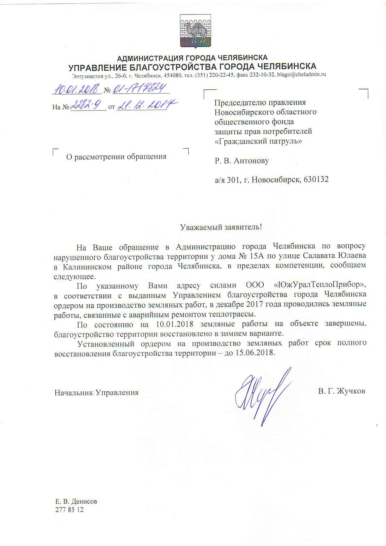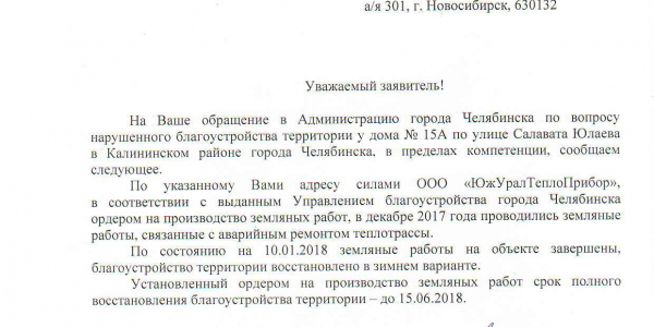 Номер жалобы:27979 Тип жалобы:Иные проблемы ЖКХ Название объекта:Администрация Калининского Района Город:Челябинск Адрес:Челябинск, улица Салавата Юлаева, 15А Описание жалобы:После проведения работ (замена труб или что-то подобное), земляные кучи с кусками асфальта так и остались лежать посреди детской площадки. Просим убрать! Статус: