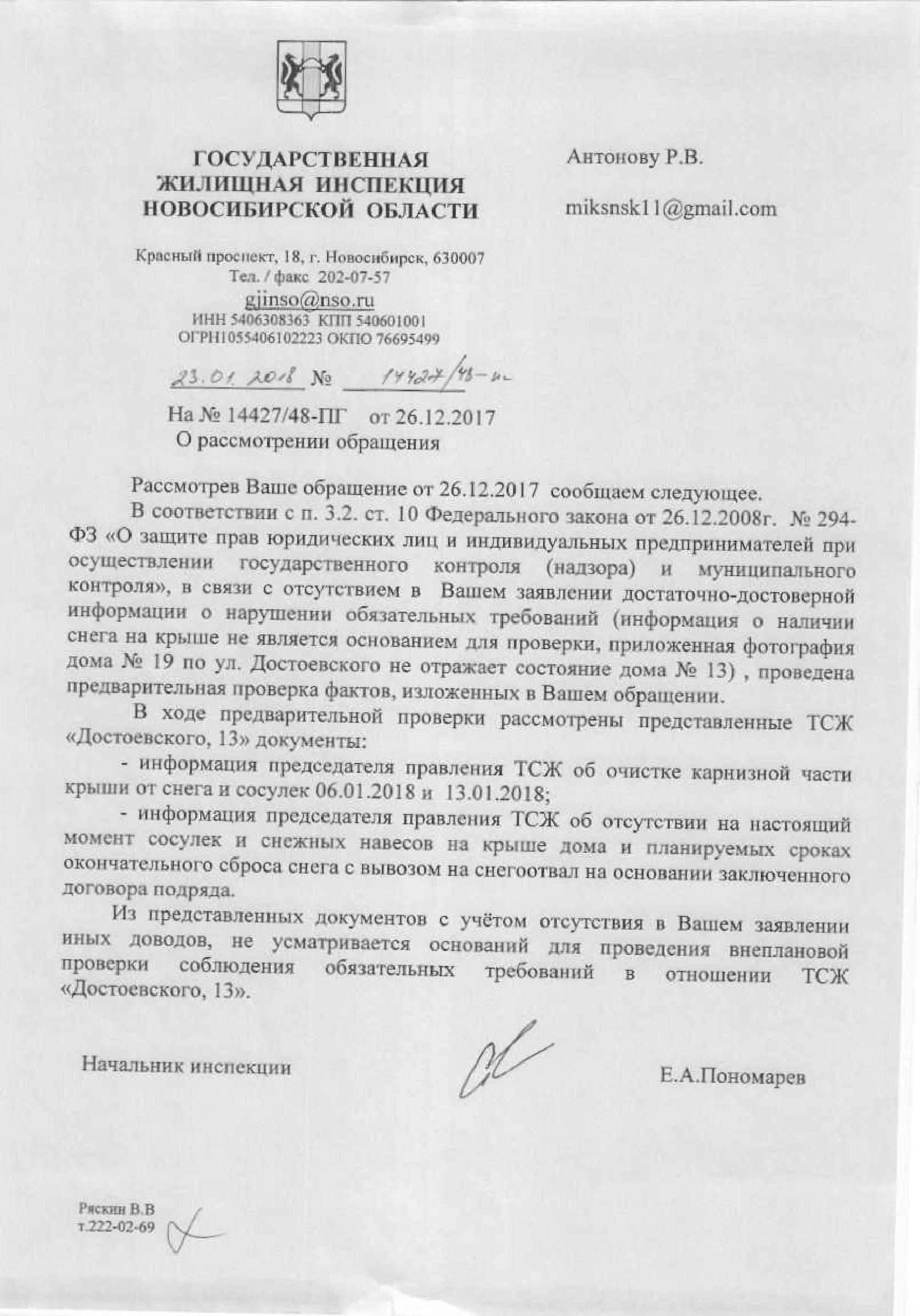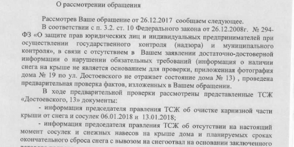 Номер жалобы:27989 Тип жалобы:Иные проблемы ЖКХ Название объекта:Управляющая Компания Регион:Новосибирская область Город:Новосибирск Адрес:ул. Достоевского, 19/35 Описание жалобы:Достоевского 19 снег на крыше дома Статус: