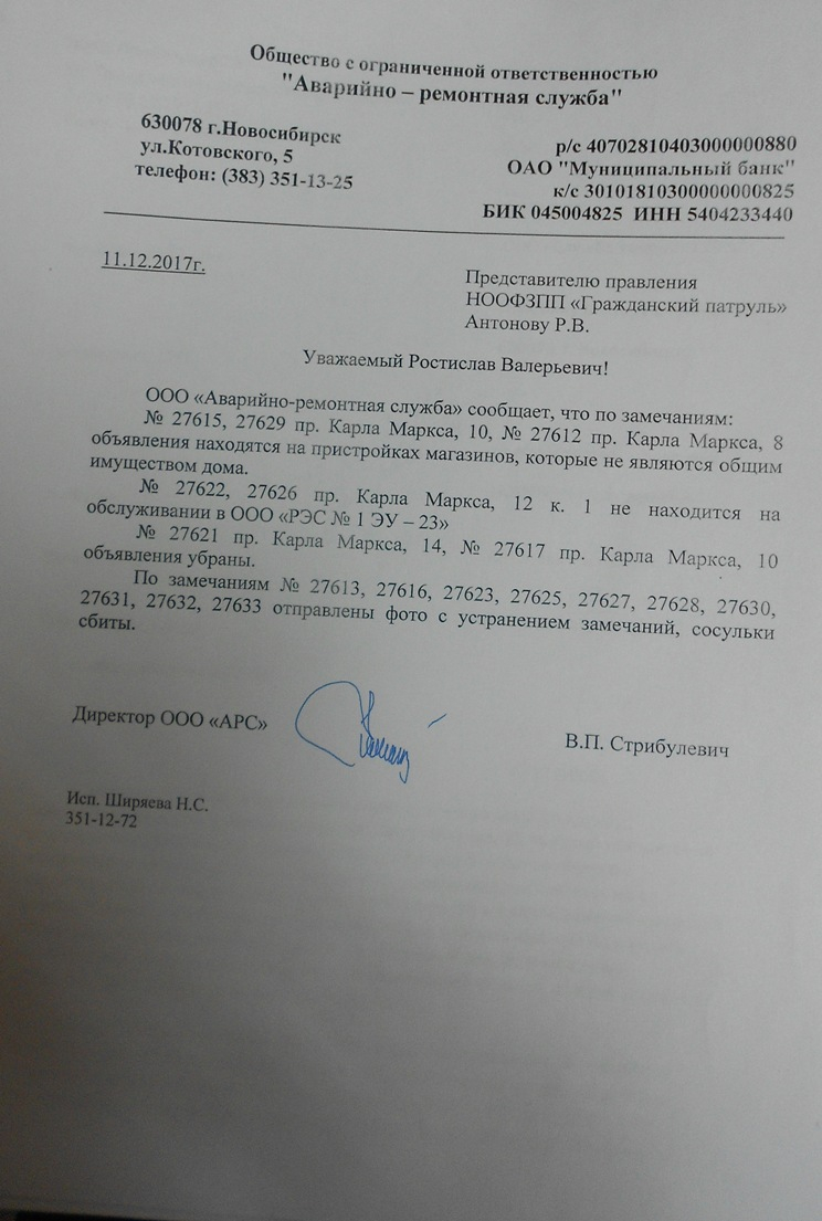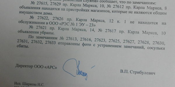 Номер жалобы:27617 Тип жалобы:Иные проблемы ЖКХ Название объекта:Управляющая Компания Регион:Новосибирская область Город:Новосибирск Адрес:пр. Карла Маркса, 10 Описание жалобы:Объявления в неположенном Статус: