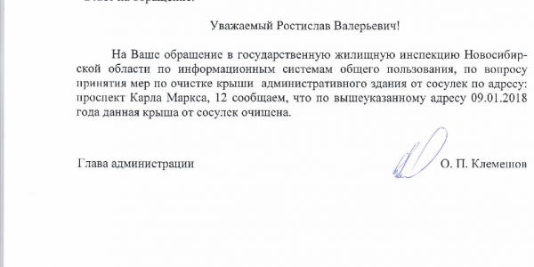 Номер жалобы:27618 Тип жалобы:Иные проблемы ЖКХ Название объекта:Управляющая Компания Регион:Новосибирская область Город:Новосибирск Адрес:пр. Карла Маркса, 12 Описание жалобы:Сосульки на крыше Статус: