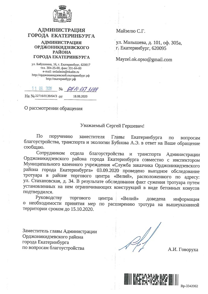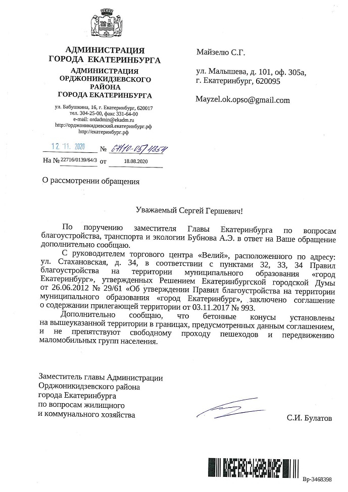 Номер жалобы:68104 Тип жалобы:Прочее Название объекта:мэрия Регион:Свердловская область Город:Екатеринбург Адрес:улица Уральских Рабочих, 44 Описание жалобы:Самозахват тротуара перед фасадом дома путём установки шлагбаума. Статус: