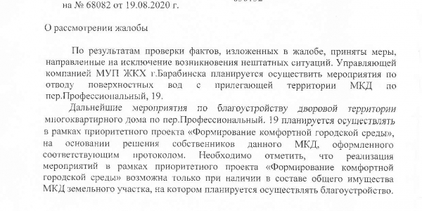 Номер жалобы:68082 Тип жалобы:Прочее Название объекта: Регион:Новосибирская область Город:Барабинск Адрес:Профессиональный переулок, 19 Описание жалобы:Затопило двор. Статус: