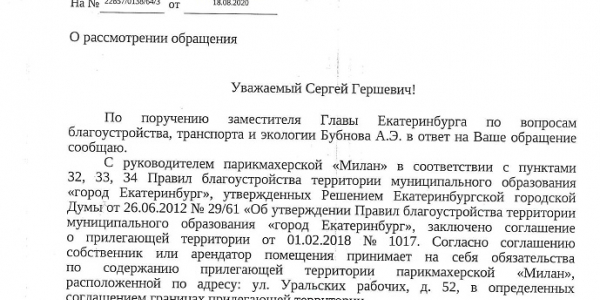 Номер жалобы:68101 Тип жалобы:Прочее Название объекта:мэрия Регион:Свердловская область Город:Екатеринбург Адрес:улица Уральских Рабочих, 52 Описание жалобы:На тротуаре у паркикмахерской «Милан» самовольно установлены ограждения. Статус: