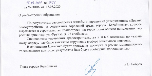 Номер жалобы:68106 Тип жалобы:Прочее Название объекта: Регион:Новосибирская область Город:Барабинск Адрес:улица Фрунзе, 97 Описание жалобы:На ул. Фрунзе. Д. 97.проживает гр. Ильченко. А. Ведёт строительство и вылез за пределы своего участка. Статус: