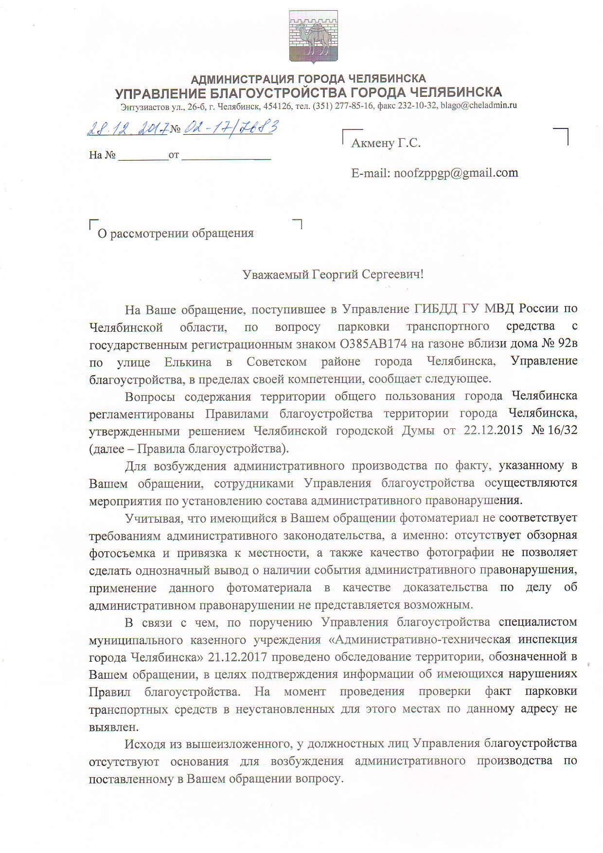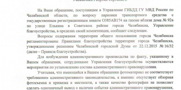 Номер жалобы:27470 Тип жалобы:Иные проблемы ЖКХ Название объекта:ГИБДД Город:Челябинск Адрес:Челябинск, улица Елькина, 92В Описание жалобы:Грузовая газель припарковалась на газоне во дворе жилого дома. Статус: