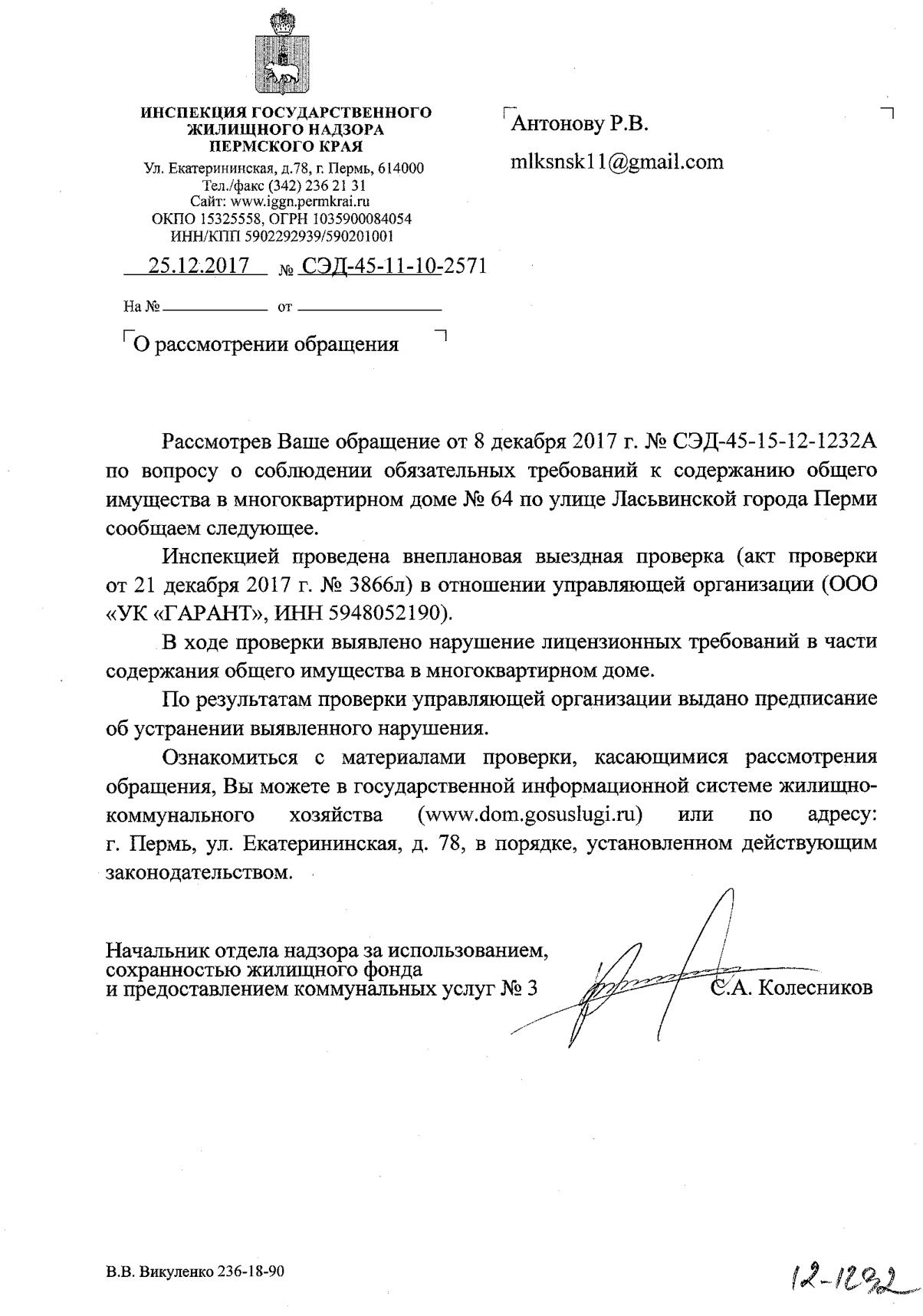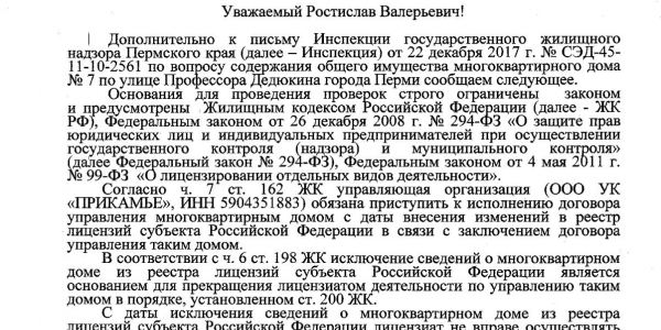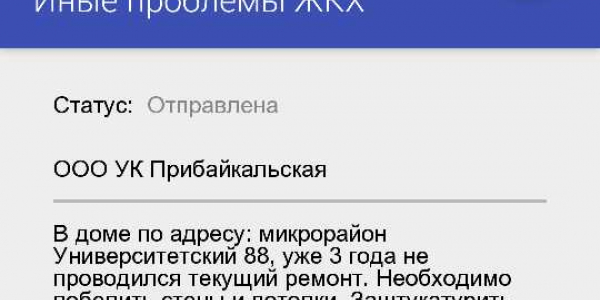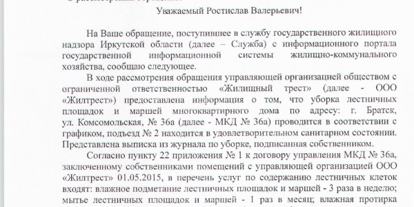 Номер жалобы:27485 Тип жалобы:Иные проблемы ЖКХ Название объекта:ООО УК Прибайкальская Регион:Иркутская область Город:Иркутск Адрес:микрорайон Университетский, 88 Описание жалобы:Нет ответа по жалобе 26248 , прошло уже 33 дня. Статус: