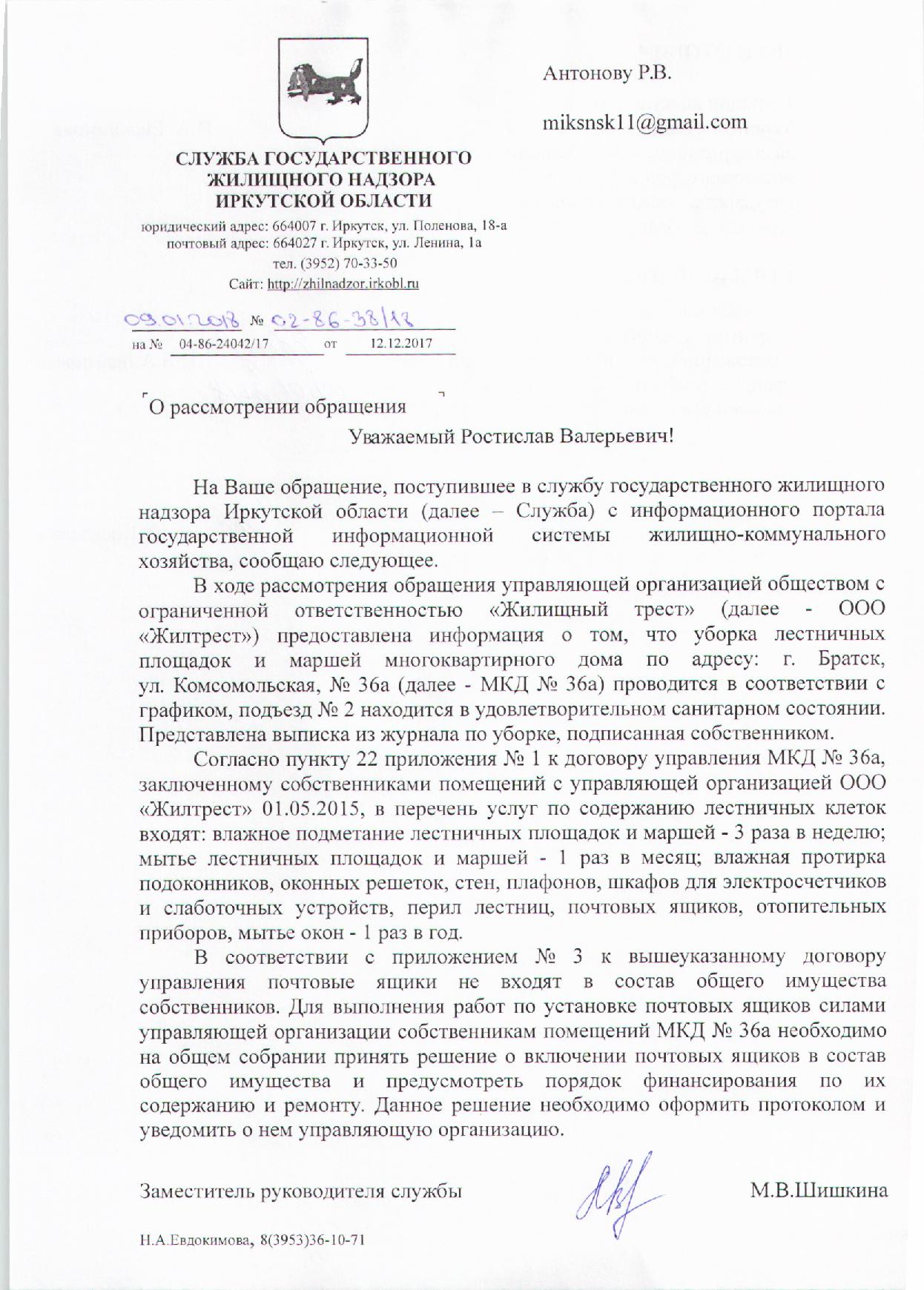 Номер жалобы:27502 Тип жалобы:Иные проблемы ЖКХ Название объекта:А Регион:Иркутская область Город:Братск Адрес:Комсомольская ул., 36A Описание жалобы:Сломанные почтовые ямщики, мусор. Подъезд 2. Статус: