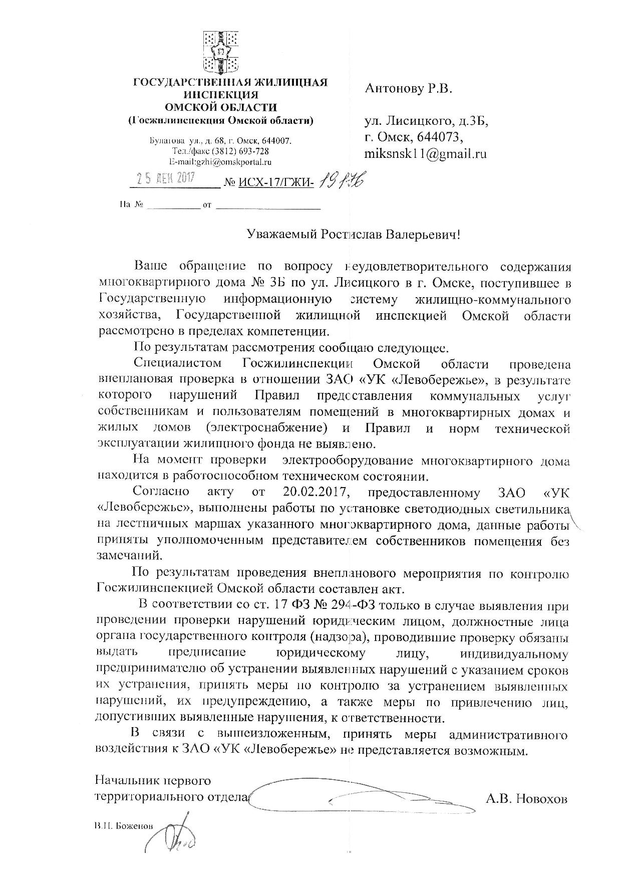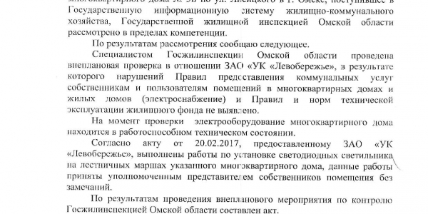 Номер жалобы:27569 Тип жалобы:Иные проблемы ЖКХ Название объекта:Левобережье Регион:Омская область Город:Омск Адрес:ул. Лисицкого, 3Б Описание жалобы:Нет света на первом этаже Статус:
