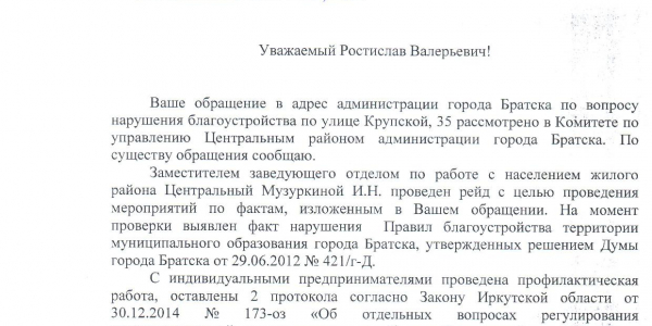 Номер жалобы:27504 Тип жалобы:Иные проблемы ЖКХ Название объекта:А Регион:Иркутская область Город:Братск Адрес:ул. Крупской, 35 Описание жалобы:Контейнер у магазина переполнен, мусор валяется вокруг Статус: