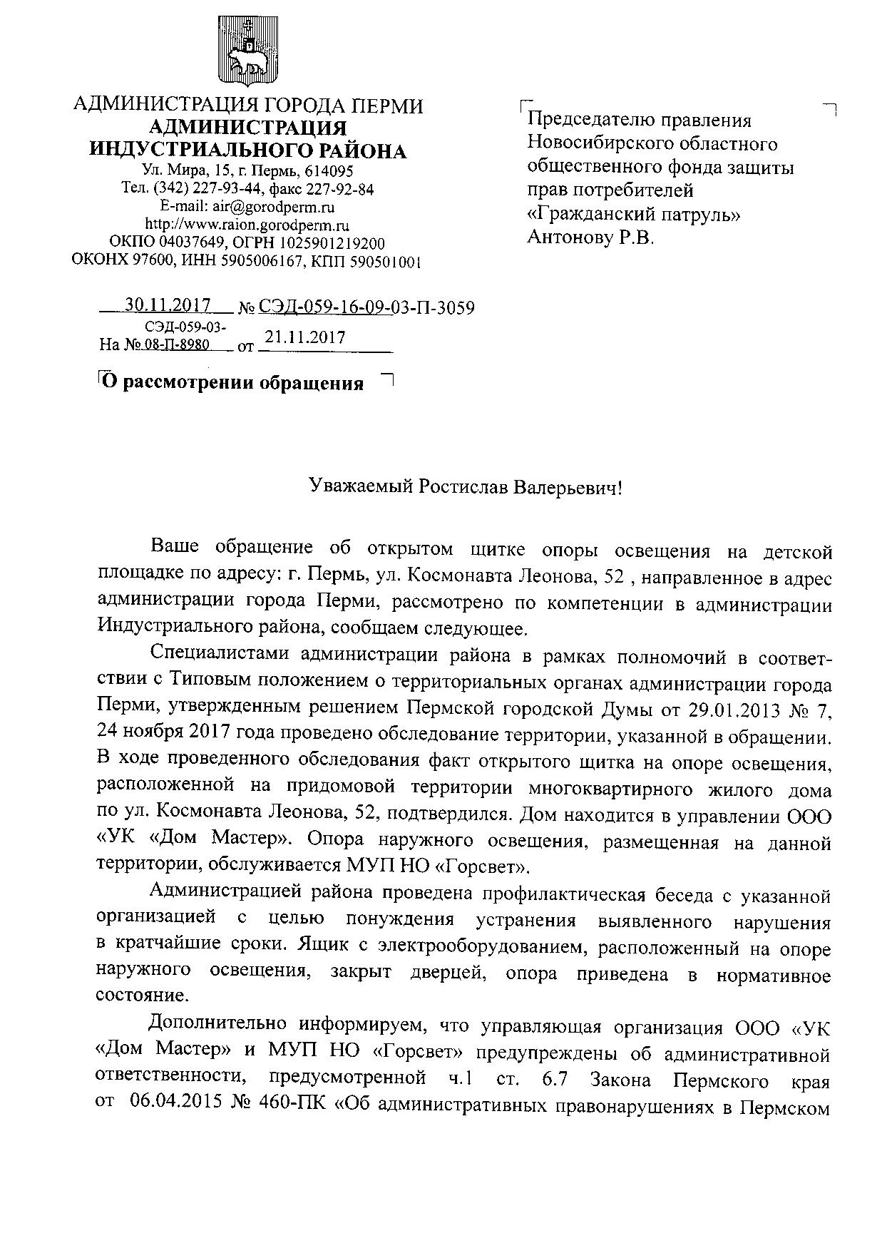 Номер жалобы:27214 Тип жалобы:Иные проблемы ЖКХ Название объекта:Березун Ксения Александровна Регион:Пермский край Город:Пермь Адрес:ул. Космонавта Леонова, 52 Описание жалобы:Фонарный столб у детской игровой площадки, щиток с проводами без дверцы Статус: