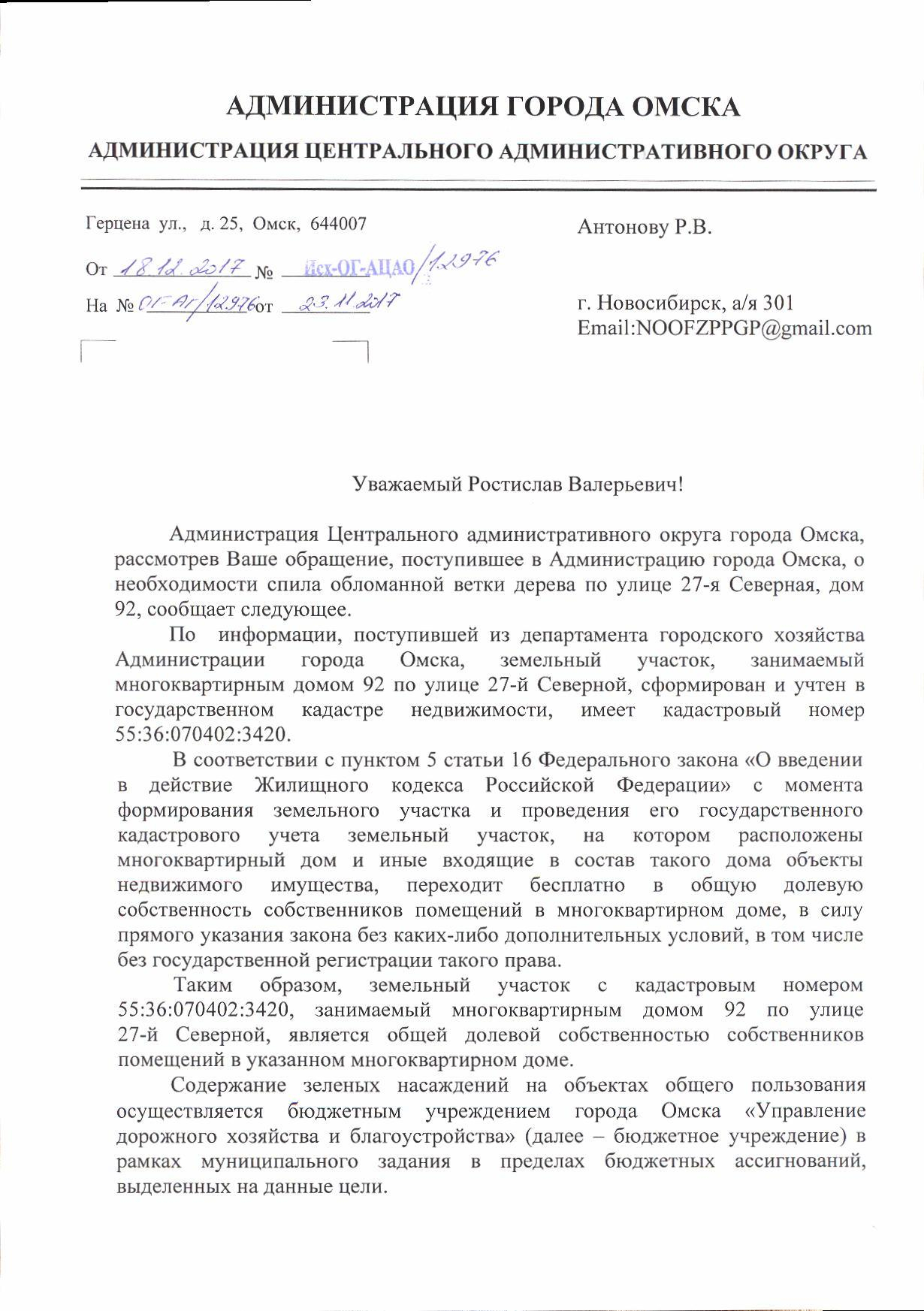 Номер жалобы:27243 Тип жалобы:Иные проблемы ЖКХ Название объекта:Жкх Регион:Омская область Город:Омск Адрес:ул. 24-я Северная, 171 Описание жалобы:Ограждена "парковка" законно? Статус: