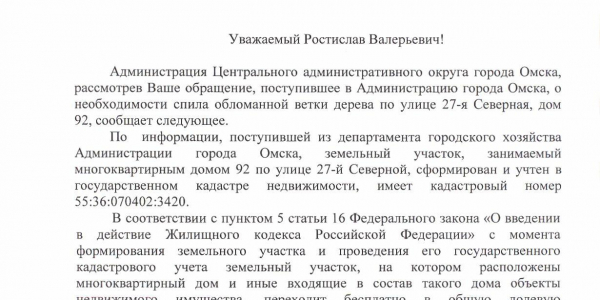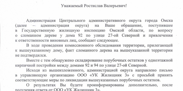 Номер жалобы:27244 Тип жалобы:Иные проблемы ЖКХ Название объекта:Жкх Регион:Омская область Город:Омск Адрес:ул. 27-я Северная, 92 Описание жалобы:Дерево сломано, видно, что давно, никому дела нет, пока на бошку кому-нибудь не упадёт Статус: