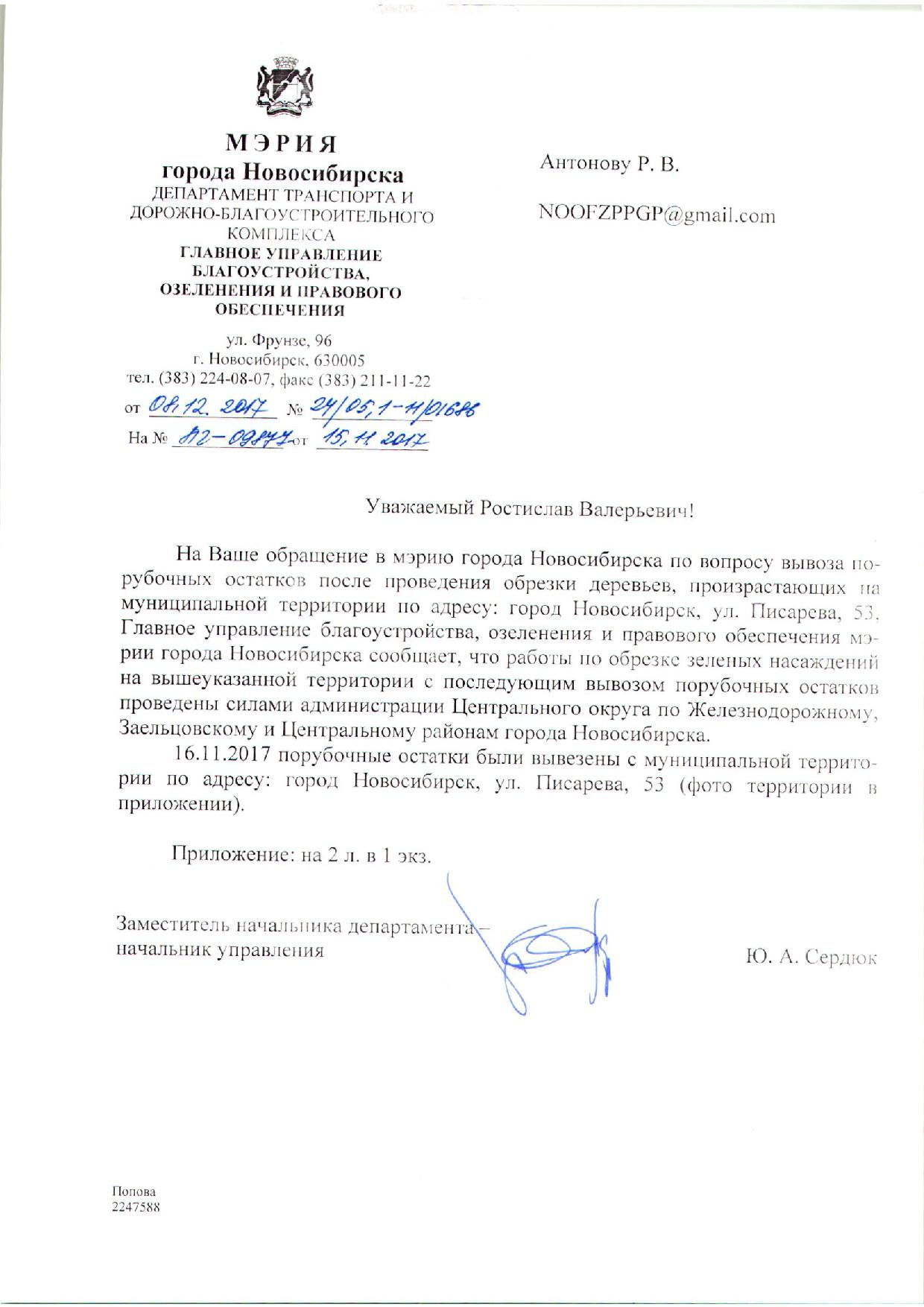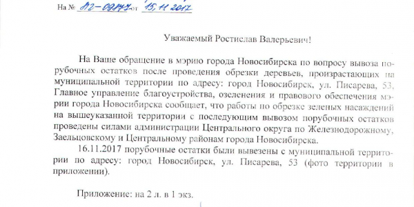 Номер жалобы:27051 Тип жалобы:Иные проблемы ЖКХ Название объекта:Управляющая Компания Регион:Новосибирская область Город:Новосибирск Адрес:ул. Писарева, 53 Описание жалобы:Писарева 53,не убраны ветки Статус: