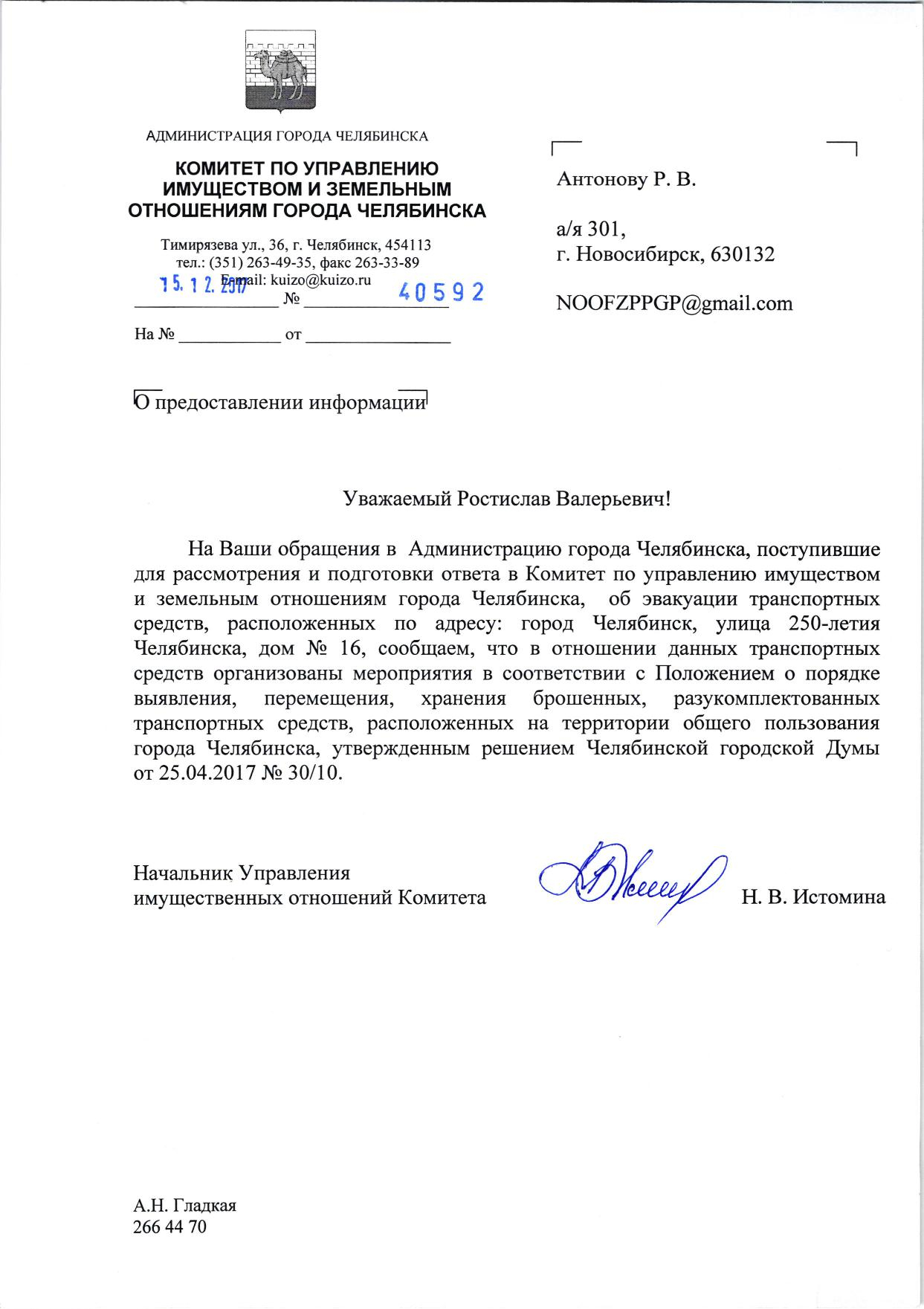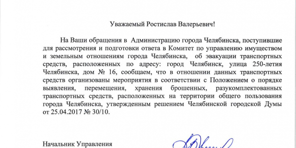 Номер жалобы:27070 Тип жалобы:Иные проблемы ЖКХ Название объекта:Администрация Города Челябинска Город:Челябинск Адрес:Челябинск, улица 250-Летия Челябинска, 16 Описание жалобы:Брошенный автомобиль во дворе жилого дома Статус: