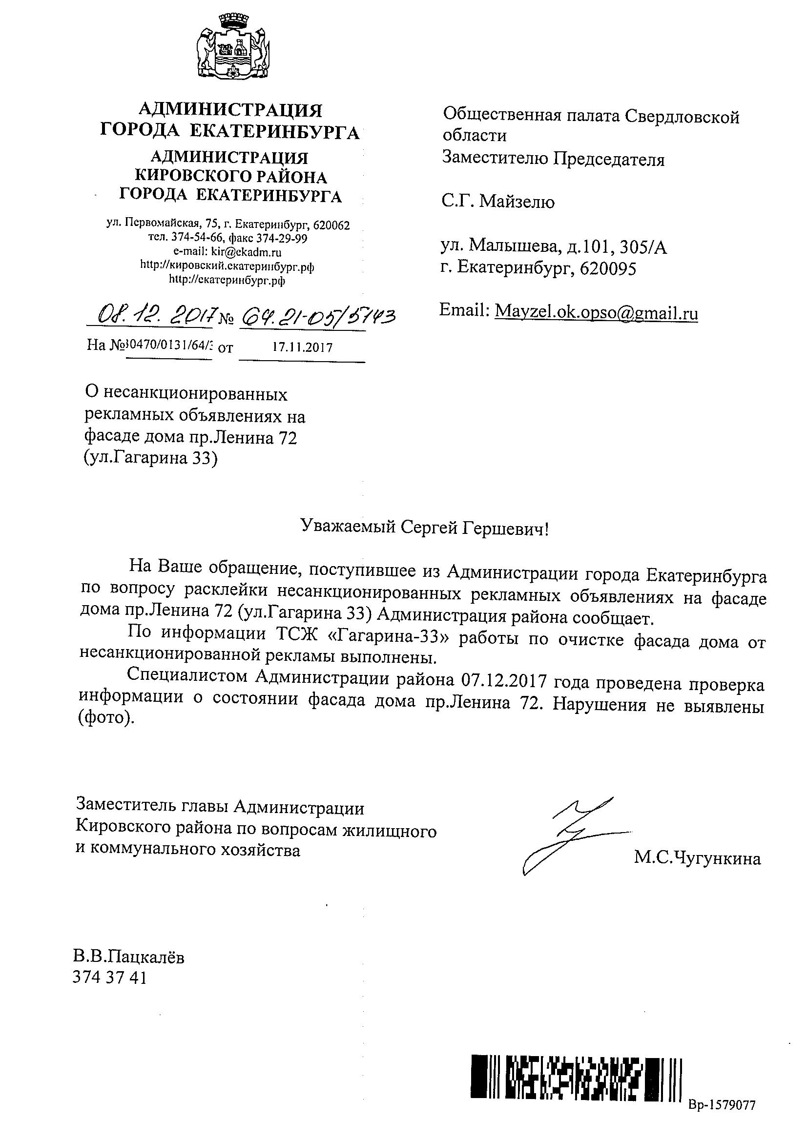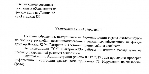 Номер жалобы:27062 Тип жалобы:Иные проблемы ЖКХ Название объекта:ТСЖ Ленина, 72 Регион:Свердловская область Город:Екатеринбург Адрес:пл. Кирова, Описание жалобы:Надписи на северном фасаде дома. Статус: