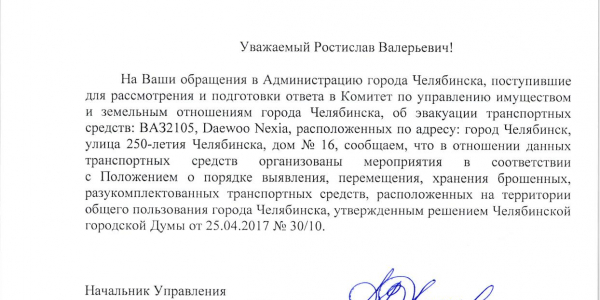 Номер жалобы:27068 Тип жалобы:Иные проблемы ЖКХ Название объекта:Администрация Города Челябинска Город:Челябинск Адрес:Челябинск, улица 250-Летия Челябинска, 16 Описание жалобы:Брошенный автомобиль во дворе жилого дома Статус: