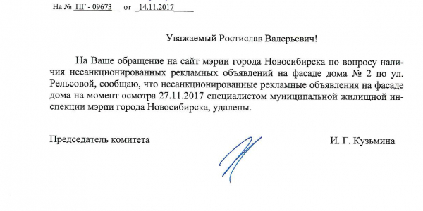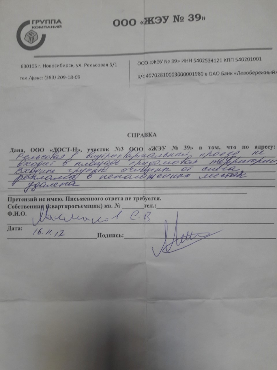 Номер жалобы:26772 Тип жалобы:Иные проблемы ЖКХ Название объекта:Управляющая Компания Регион:Новосибирская область Город:Новосибирск Адрес:ул. Рельсовая, 2/2 Описание жалобы:Объявление на фасаде дома Статус: