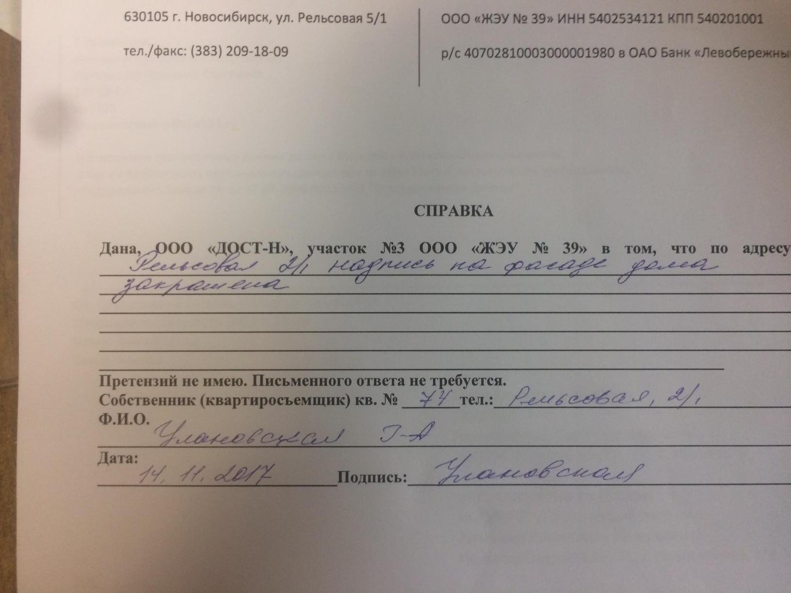 Номер жалобы:26770 Тип жалобы:Иные проблемы ЖКХ Название объекта:Управляющая Компания Регион:Новосибирская область Город:Новосибирск Адрес:ул. Рельсовая, 2/1 Описание жалобы:Надписи на фасаде дома Статус: