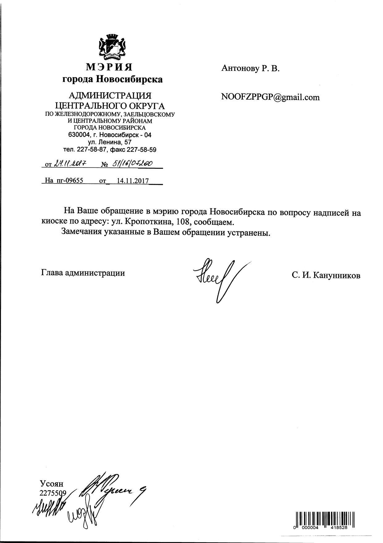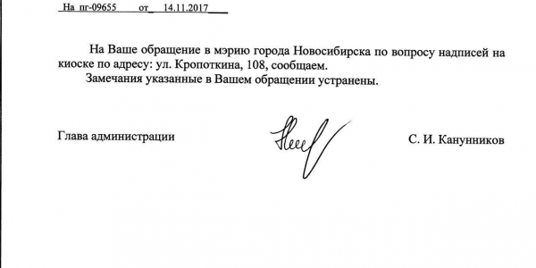 Номер жалобы:26748 Тип жалобы:Иные проблемы ЖКХ Название объекта:Управляющая Компания Регион:Новосибирская область Город:Новосибирск Адрес:ул. Кропоткина, 108 Описание жалобы:Надписи на киоске Статус: