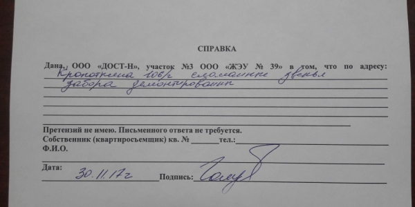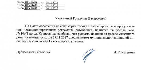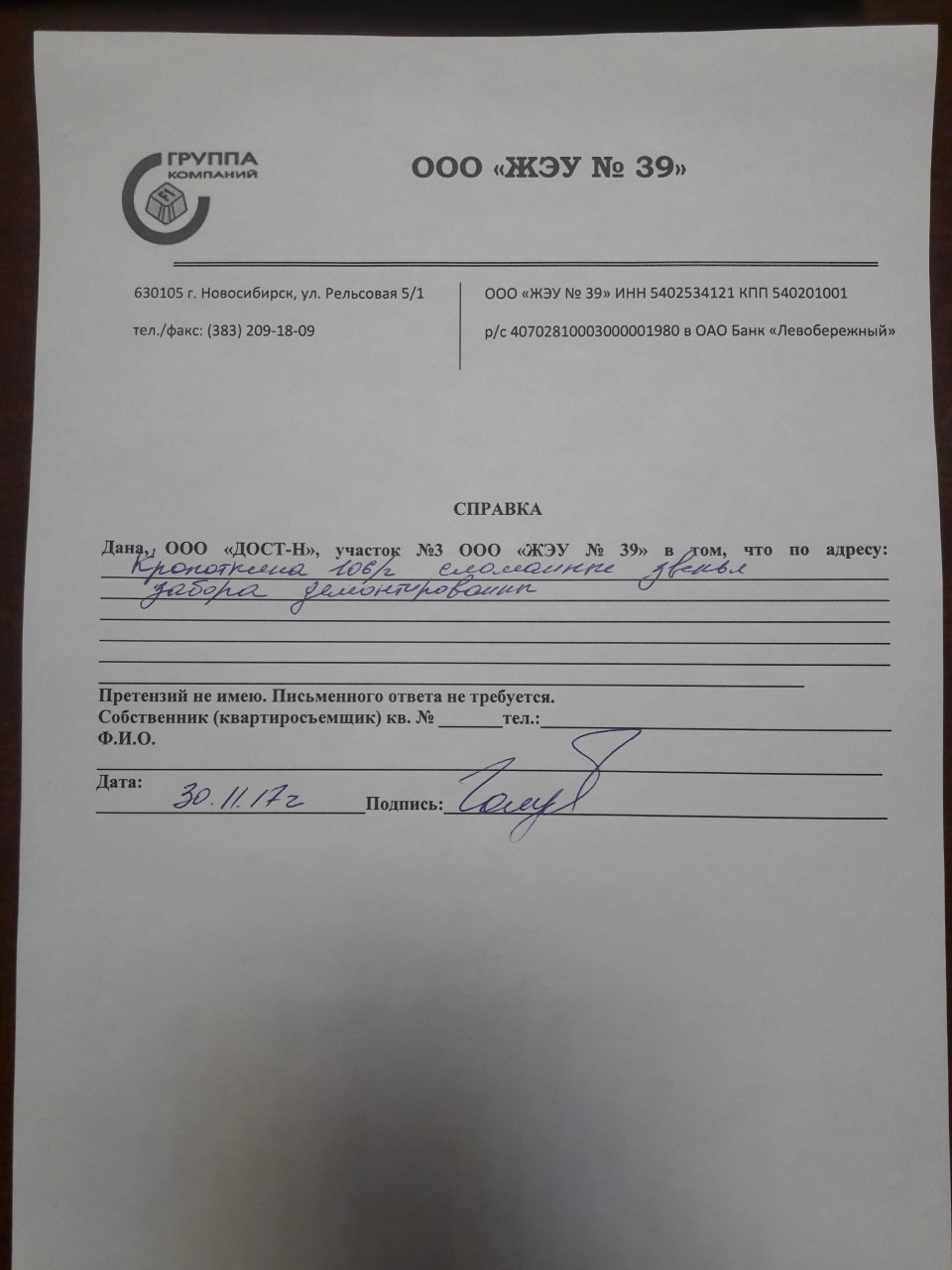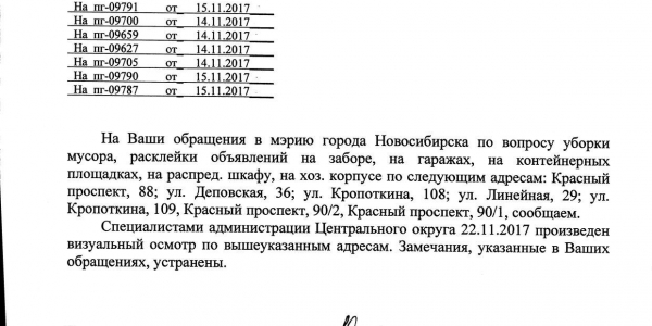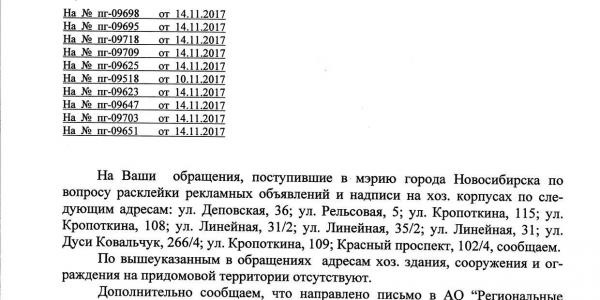 Номер жалобы:26747 Тип жалобы:Иные проблемы ЖКХ Название объекта:Управляющая Компания Регион:Новосибирская область Город:Новосибирск Адрес:ул. Кропоткина, 106/1 Описание жалобы:Объявления в неположенном месте Статус: