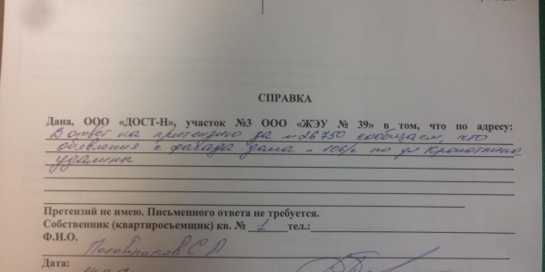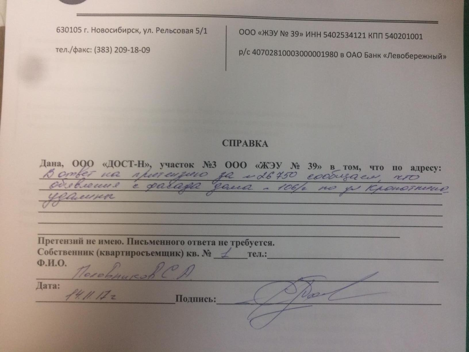 Номер жалобы:26750 Тип жалобы:Иные проблемы ЖКХ Название объекта:Управляющая Компания Регион:Новосибирская область Город:Новосибирск Адрес:ул. Кропоткина, 106/2 Описание жалобы:Объявления на фасаде дома Статус: