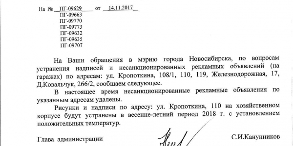 Номер жалобы:26753 Тип жалобы:Иные проблемы ЖКХ Название объекта:Управляющая Компания Регион:Новосибирская область Город:Новосибирск Адрес:ул. Кропоткина, 108 Описание жалобы:Надписи на фасаде дома Статус: