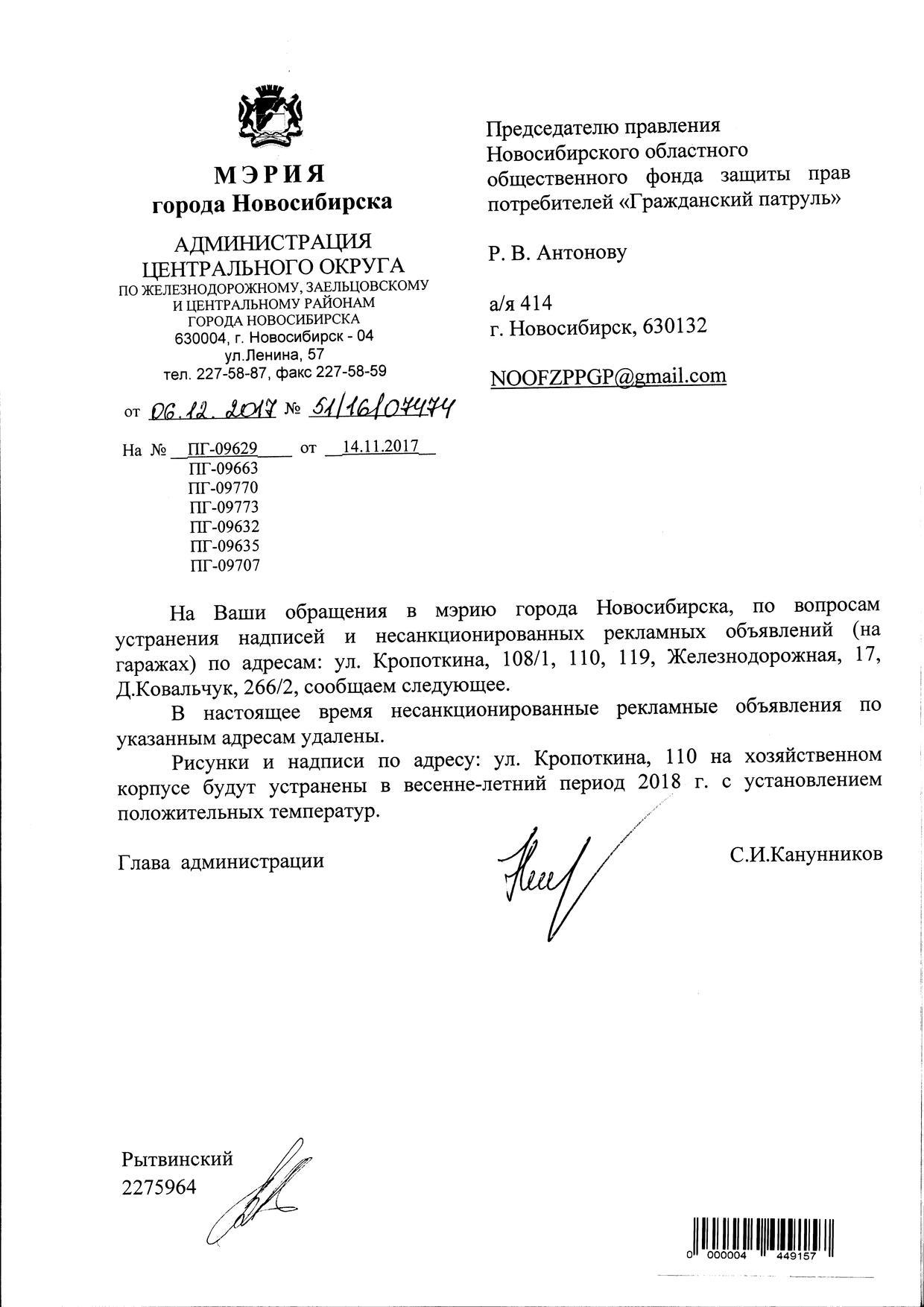 Номер жалобы:26723 Тип жалобы:Иные проблемы ЖКХ Название объекта:Управляющая Компания Регион:Новосибирская область Город:Новосибирск Адрес:ул. Кропоткина, 115 Описание жалобы:Надписи и объявления на гаражах Статус: