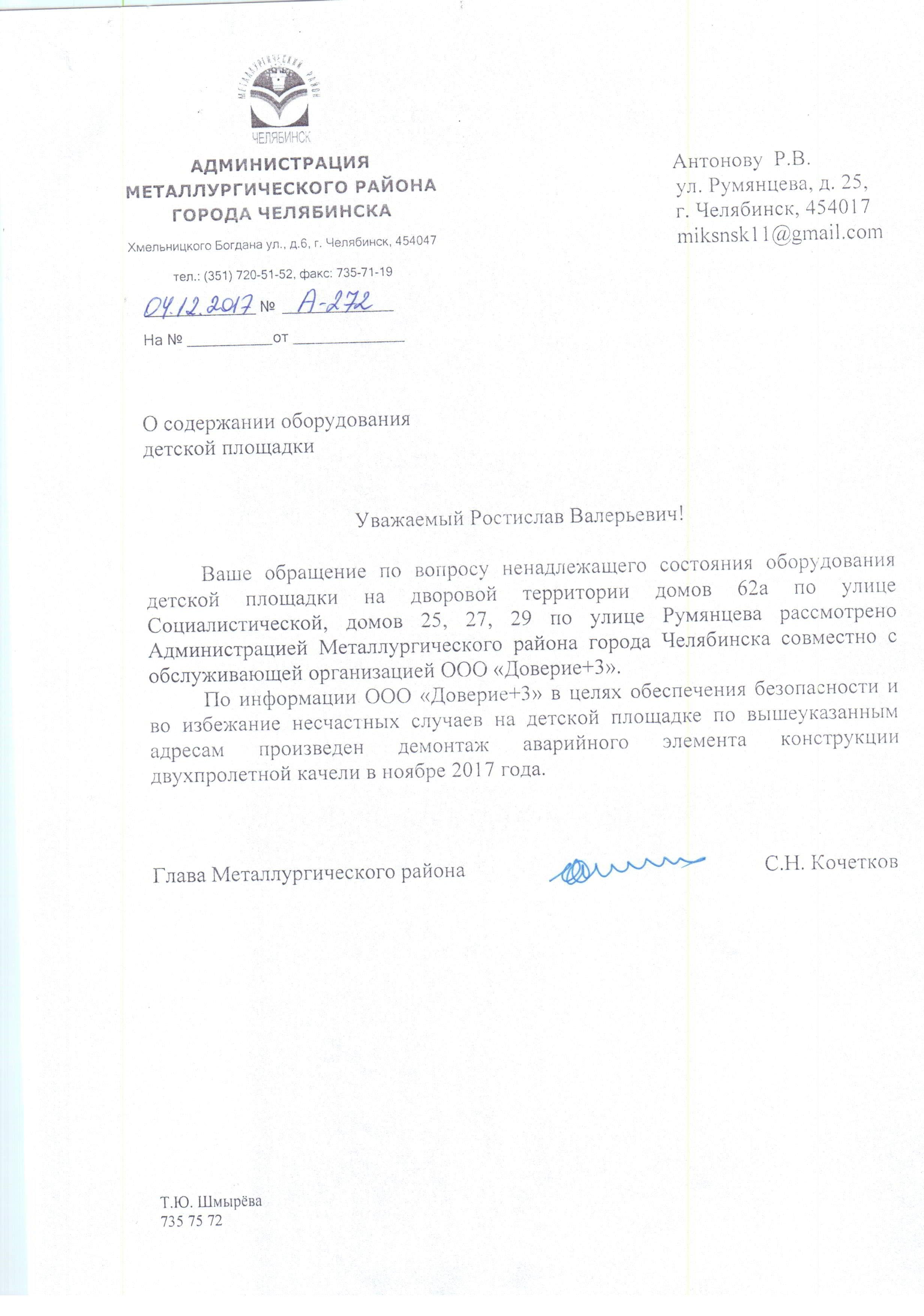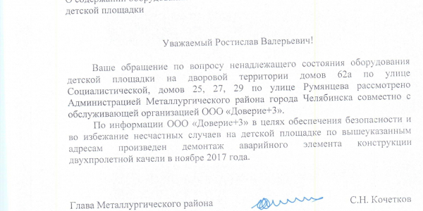 Номер жалобы:26653 Тип жалобы:Иные проблемы ЖКХ Название объекта:Администрация Металлургического Района, Г.Челябинска Регион:Челябинская область Город:Челябинск Адрес:ул. Румянцева, 25/61 Описание жалобы:Качель сломана с лета ещё, никто не устранил или не починил её. Опасность для детей Статус: