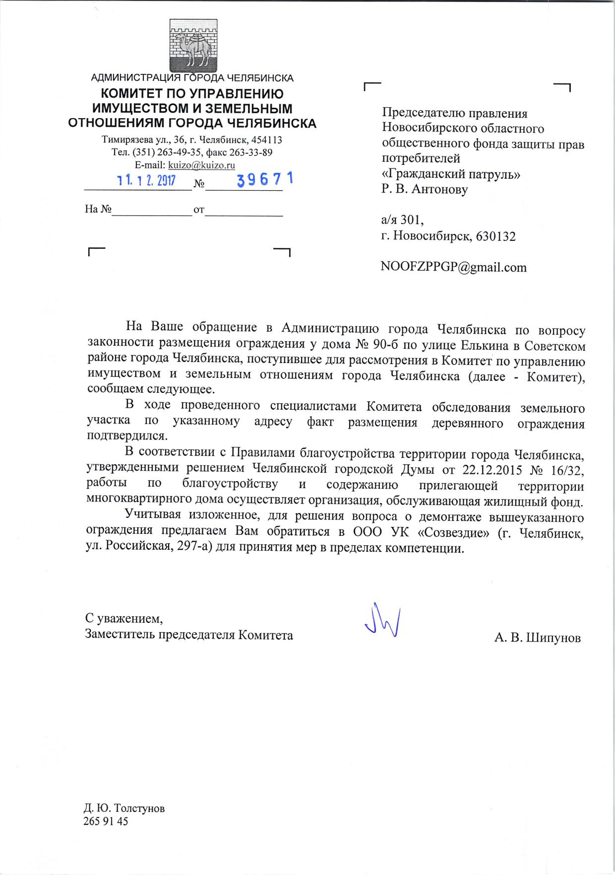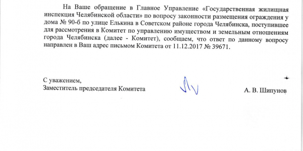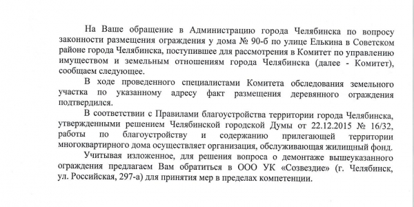 Номер жалобы:26658 Тип жалобы:Иные проблемы ЖКХ Название объекта:Мэрия Город:Челябинск Адрес:Челябинск, улица Елькина, 90Б Описание жалобы:Прошу проверить законность установки забора между Елькина 90Б и Красной 113 Статус: