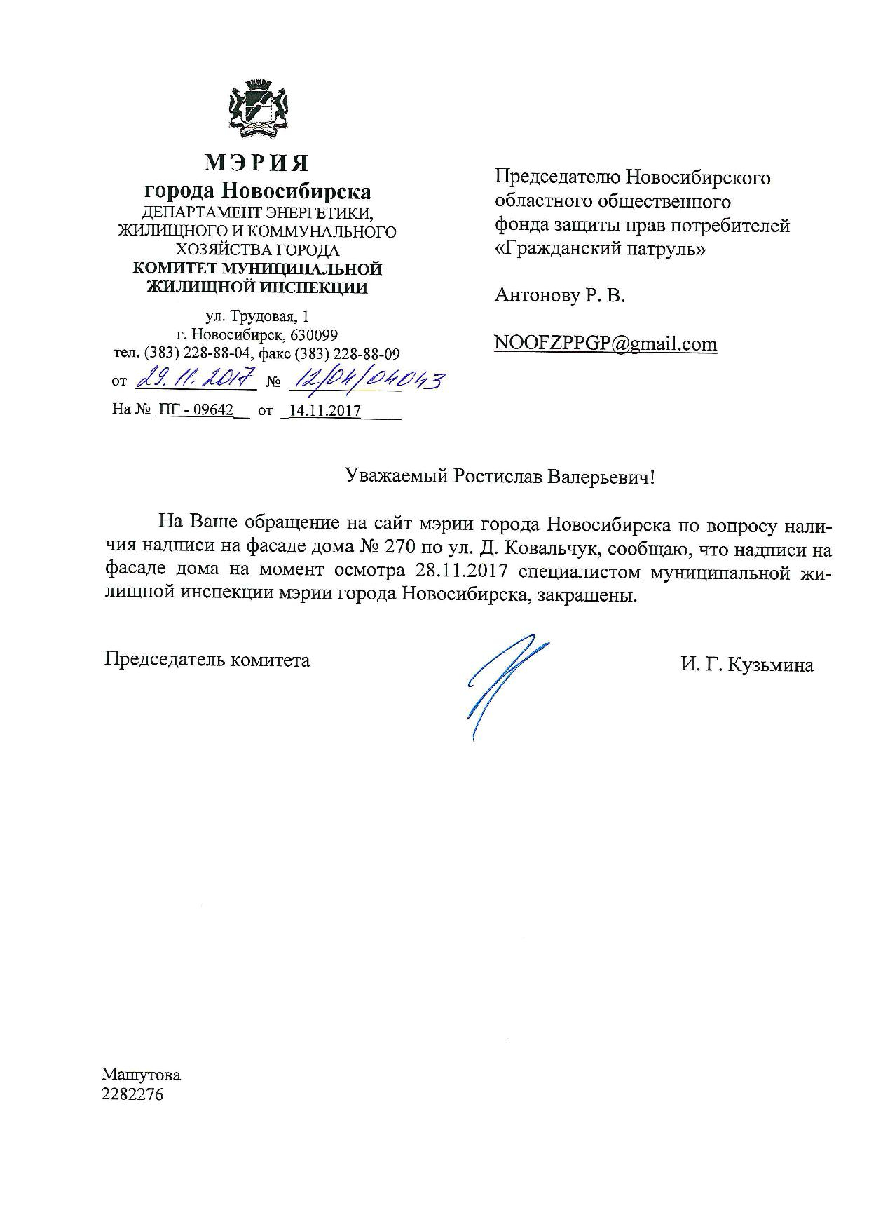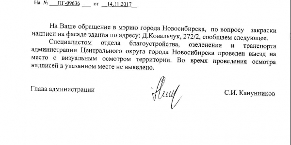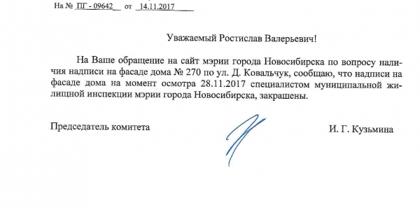 Номер жалобы:26674 Тип жалобы:Иные проблемы ЖКХ Название объекта:Управляющая Компания Регион:Новосибирская область Город:Новосибирск Адрес:ул. Дуси Ковальчук, 270 Описание жалобы:Надписи на фасаде дома Статус: