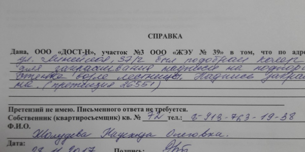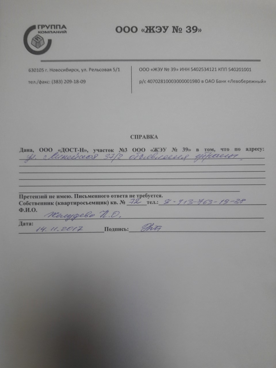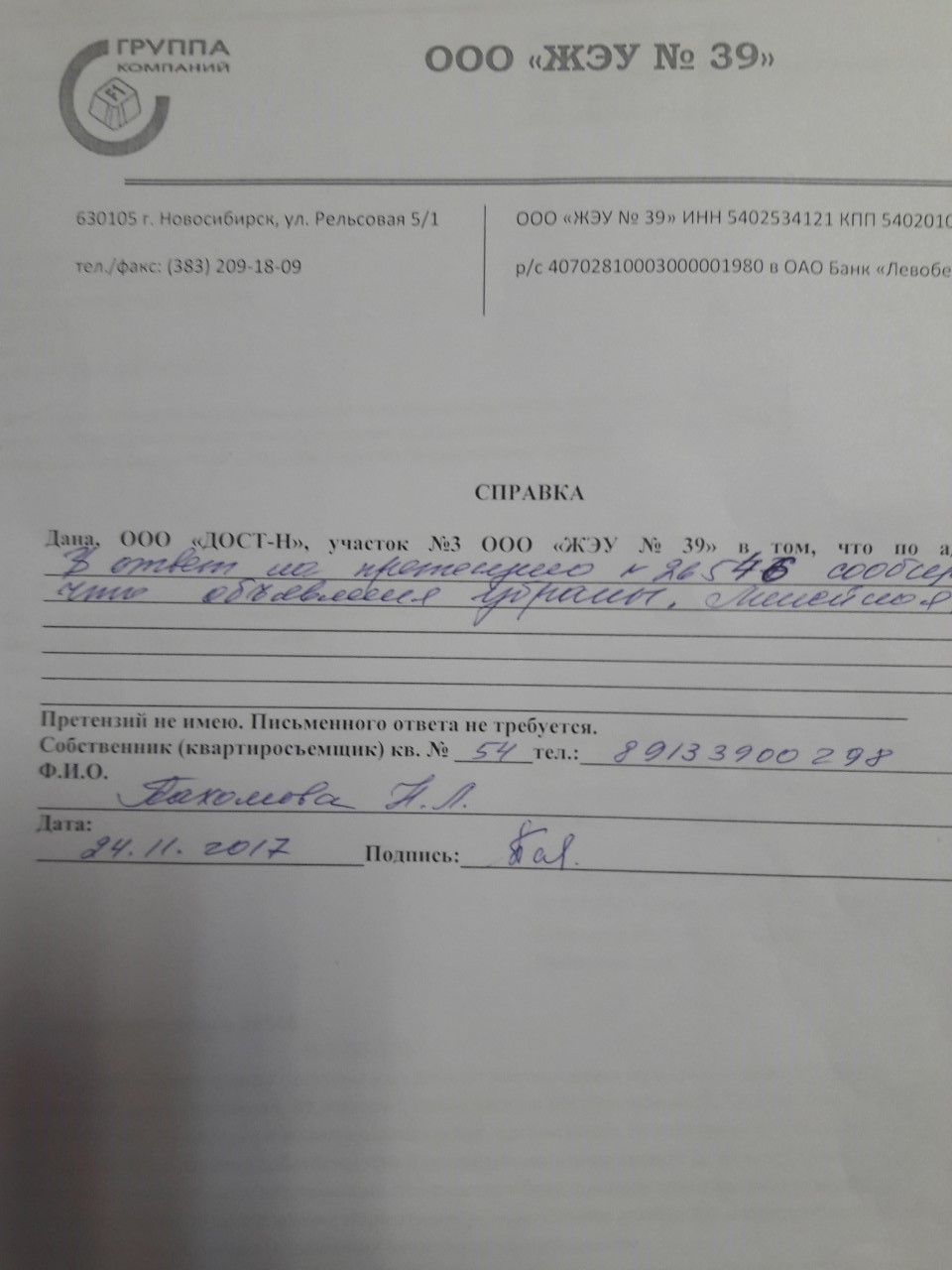 Номер жалобы:26553 Тип жалобы:Иные проблемы ЖКХ Название объекта:Управляющая Компания Регион:Новосибирская область Город:Новосибирск Адрес:ул. Линейная, 37/2 Описание жалобы:Линейная 37/2 объявление на фасаде дома Статус: