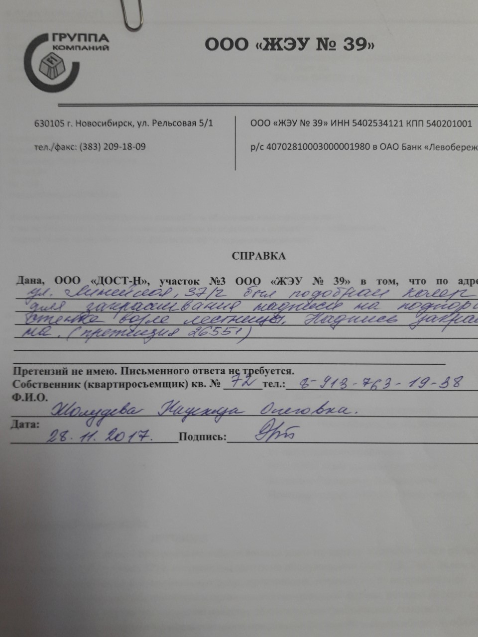 Номер жалобы:26547 Тип жалобы:Иные проблемы ЖКХ Название объекта:Управляющая Компания Регион:Новосибирская область Город:Новосибирск Адрес:ул. Линейная, 41 Описание жалобы:Надписи на фасаде Статус: