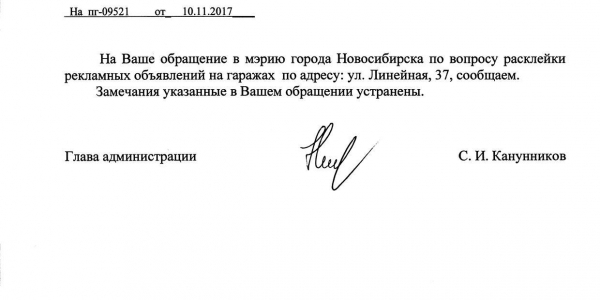 Номер жалобы:26549 Тип жалобы:Иные проблемы ЖКХ Название объекта:Управляющая Компания Регион:Новосибирская область Город:Новосибирск Адрес:ул. Линейная, 37 Описание жалобы:Линейная 37 объявления на гаражах Статус: