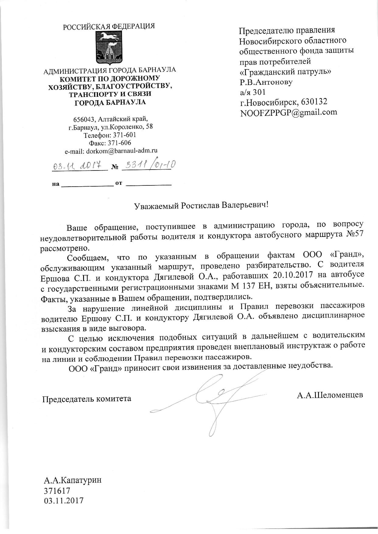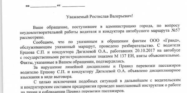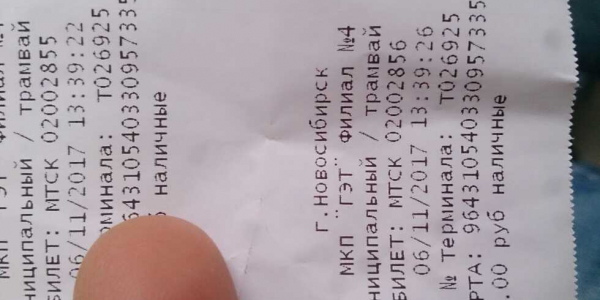Номер жалобы:26869 Тип жалобы:Общественный транспорт Название объекта:Мкп Гэт Регион:Новосибирская область Город:Новосибирск Адрес:ул. Вертковская, 61 Описание жалобы:Решил воспользоваться трамваем. Приготовил для расчета за двоих пассажиров денежные средства в сумме 36 р. Кондуктор не русская женщина подошла, взяла деньги, а билеты не дала, протянула обратно улыбаясь 6 рублей. 30 рублей хотела себе присвоить. Я потребовал билеты, она забрала остальные 6 р. назад. Остановки она не объявляет. Водитель разговаривал по телефону без гарнитуры, что запрещено делать во время работы. Позвонил диспетчеру. Говорю, что нарушение у вас, кондуктор билет не хотела давать и хотела денег взять. Что я услышал "-это вы сами их расповадили, нечего давать им 15 рублей и говорить "билет не нужен", и повешала трубку. Считаю, что это не нормально, так работать экипажу трамвая, и диспетчеру. Предлагаю установить их личности, и уволить. Или как вариант оштрафовать, оставить без премии. Время движения, и т.д. есть на фото билета. Номер маршрута 16. Ехали в сторону Маркса от вертковского Статус: