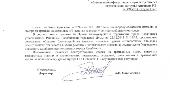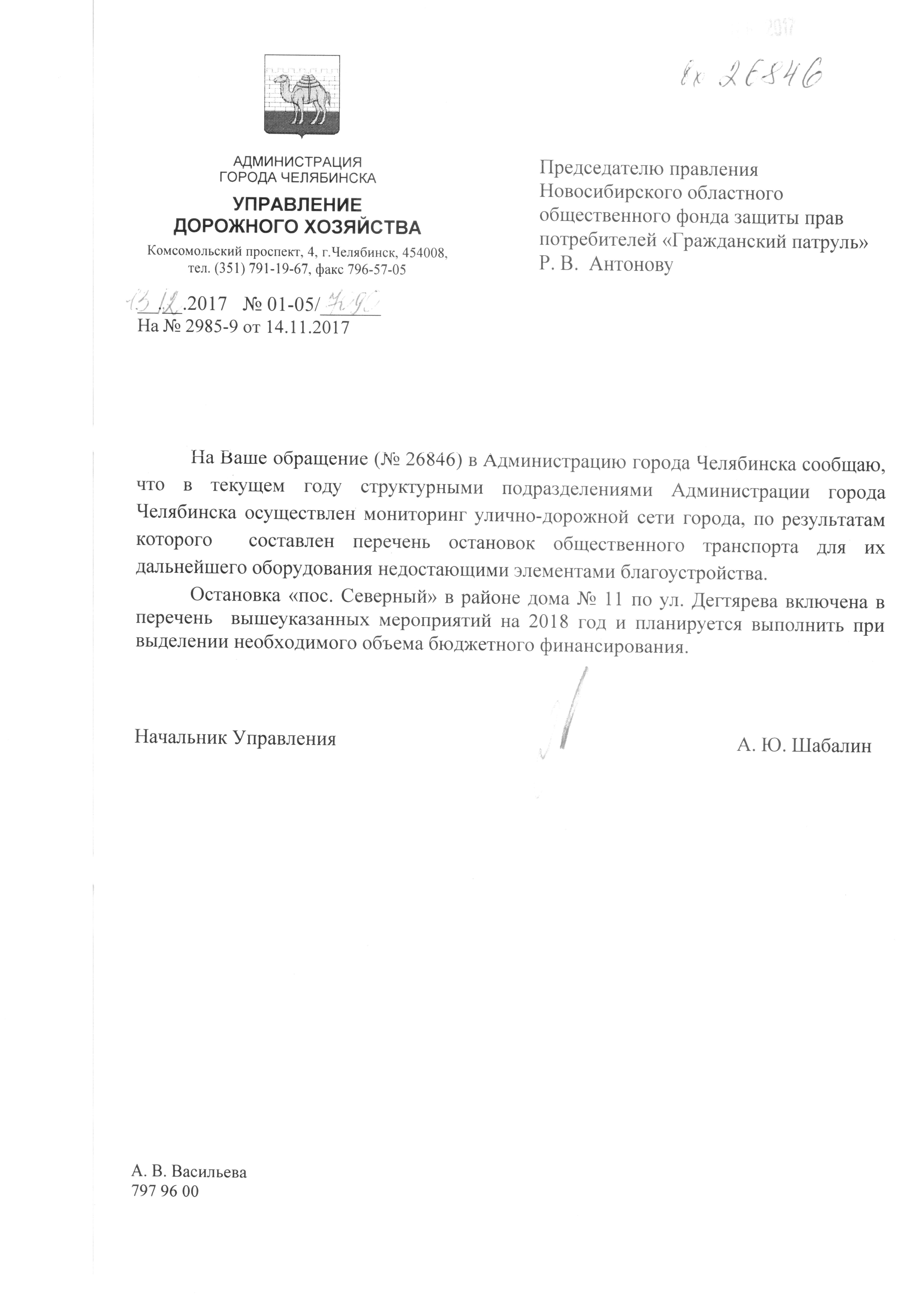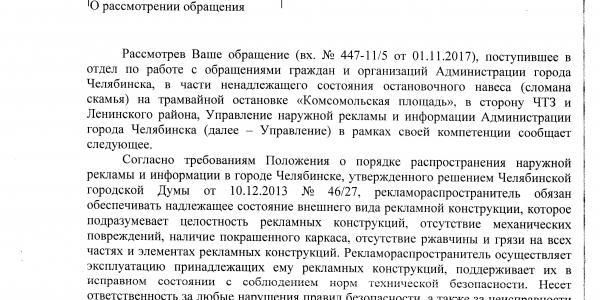 Номер жалобы:26846 Тип жалобы:Общественный транспорт Название объекта:Администрация Города Челябинска Регион:Челябинская область Город:Челябинск Адрес:ул. Дегтярева, 11 Описание жалобы:На улице Дегтярева у дома 11 есть остановка ОТ "Северный поселок". На остановке отсутствуют скамейки и крыша от дождя,асфальтовая площадка маленькая,а также отсутствует мусорная урна. Статус: