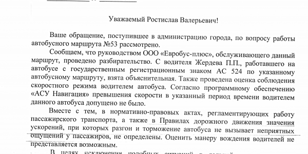 Номер жалобы:27032 Тип жалобы:Общественный транспорт Название объекта:ООО "Евробус-плюс" Регион:Алтайский край Город:Барнаул Адрес:пр. Ленина, 71А Описание жалобы:524 номер автобуса маршрут 53.Весь путь совершал резкие торможения и перестроения.Остановку кинотеатр "Россия" проехал и остановился у здания по адресу "Ленина 71,по скольку хотел обогнать 24 автобус. Статус: